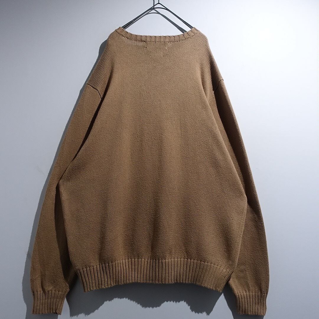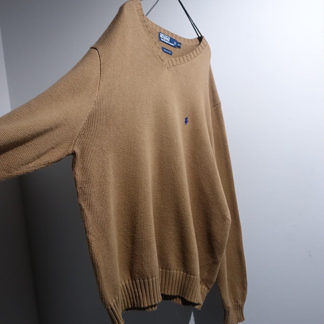 90s〜00s “Ralph Lauren” Beige Logo Design V-neck Cotton Knit