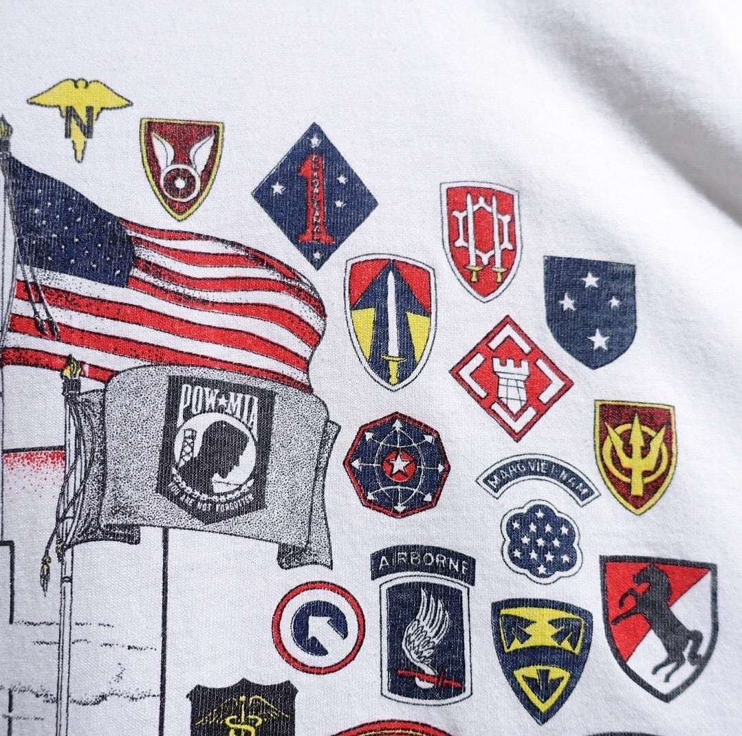 90s White Multiple Emblem Soldier Print Design T-Shirt