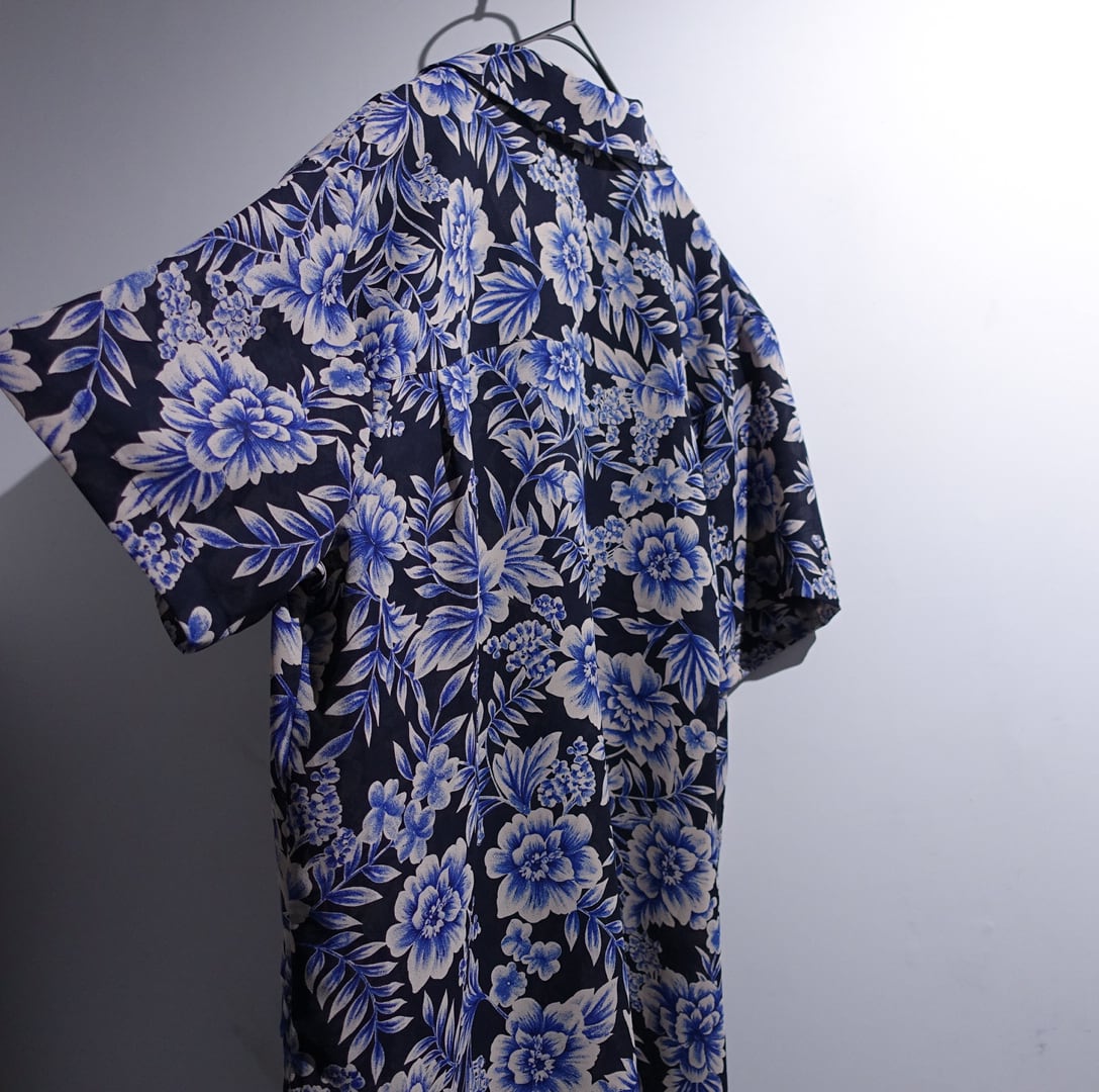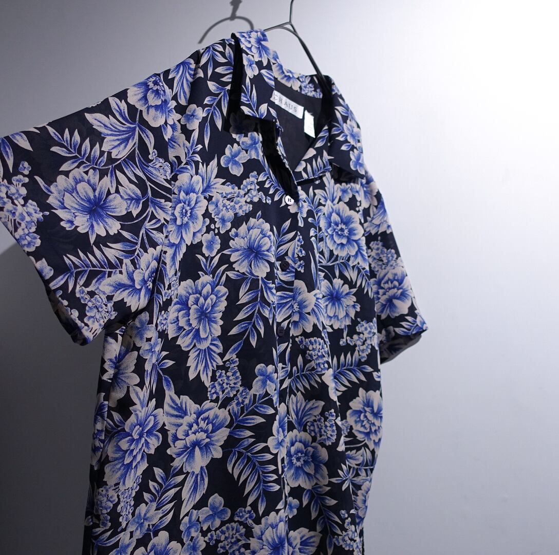 Black & Blue Flower Pattern Desgin Open Collar Shirt