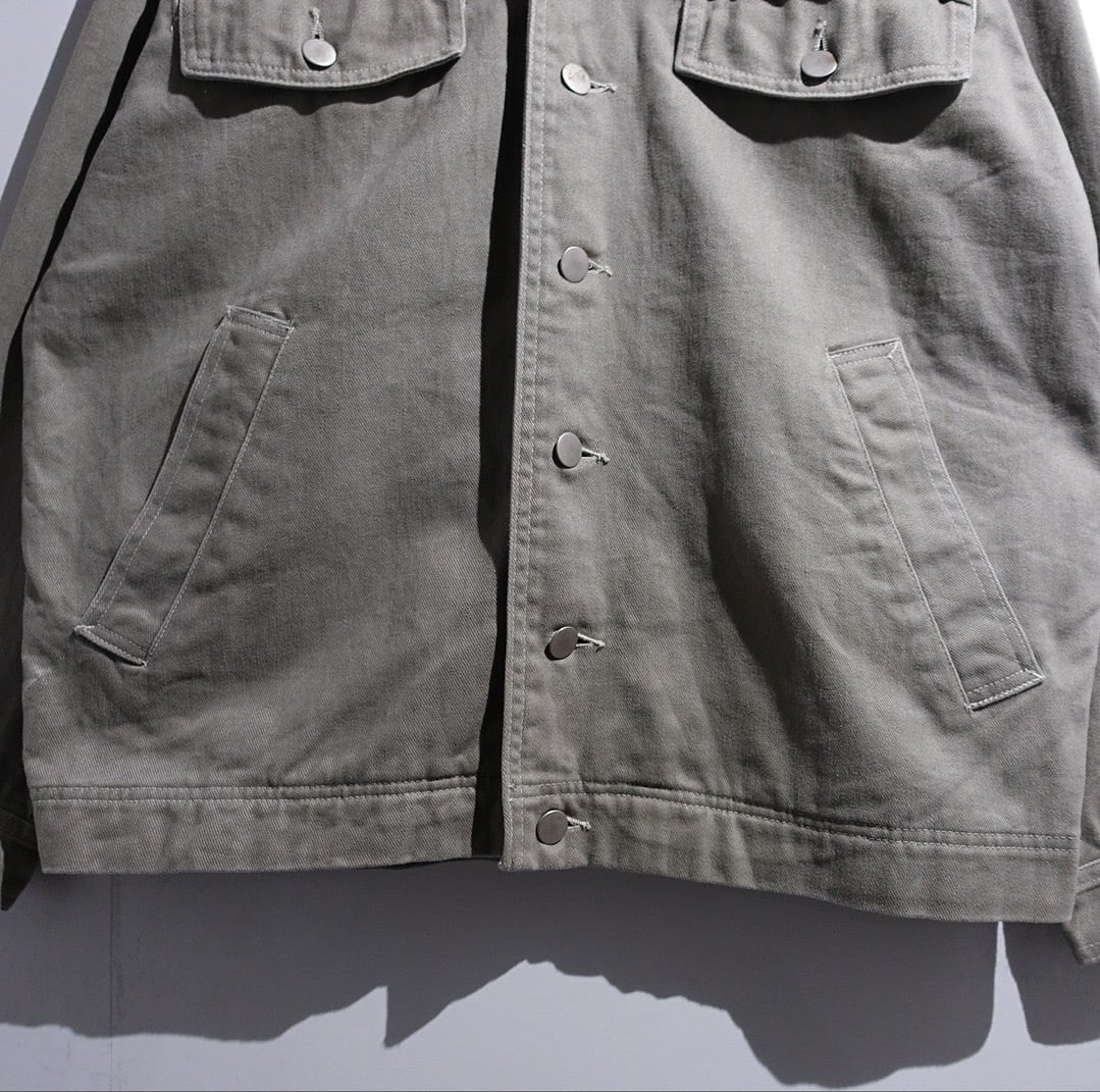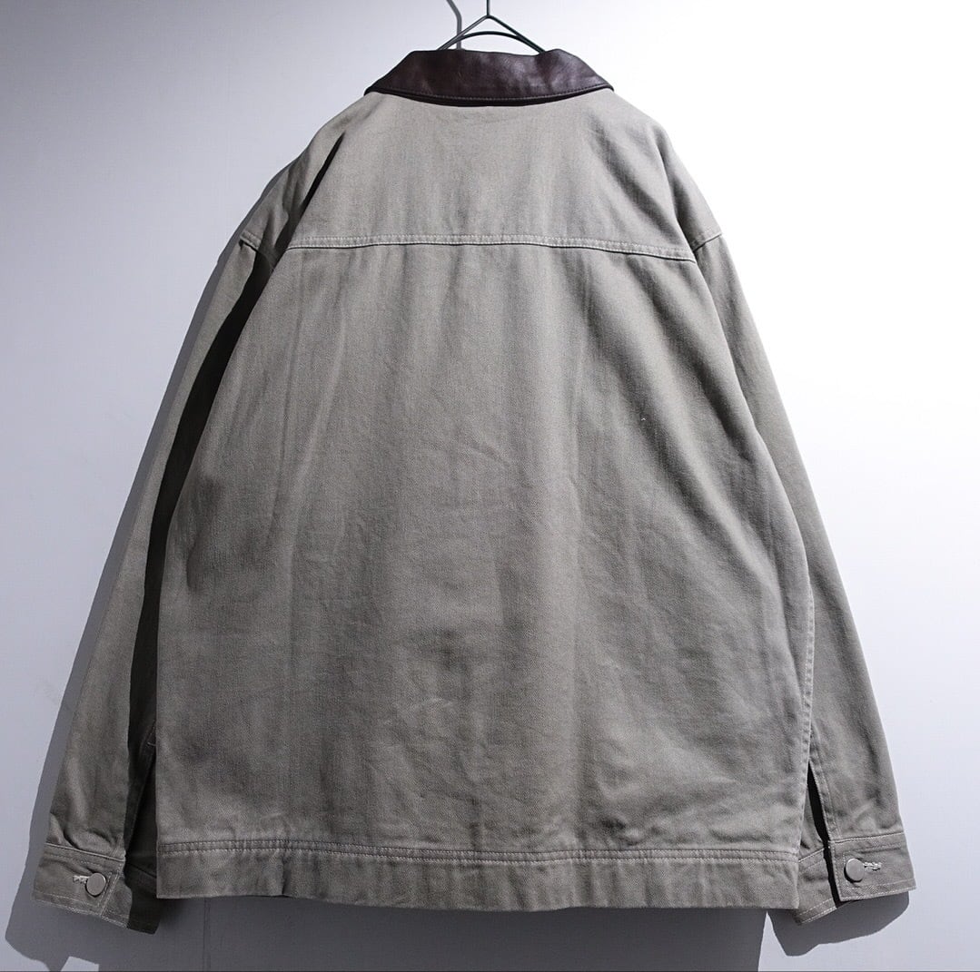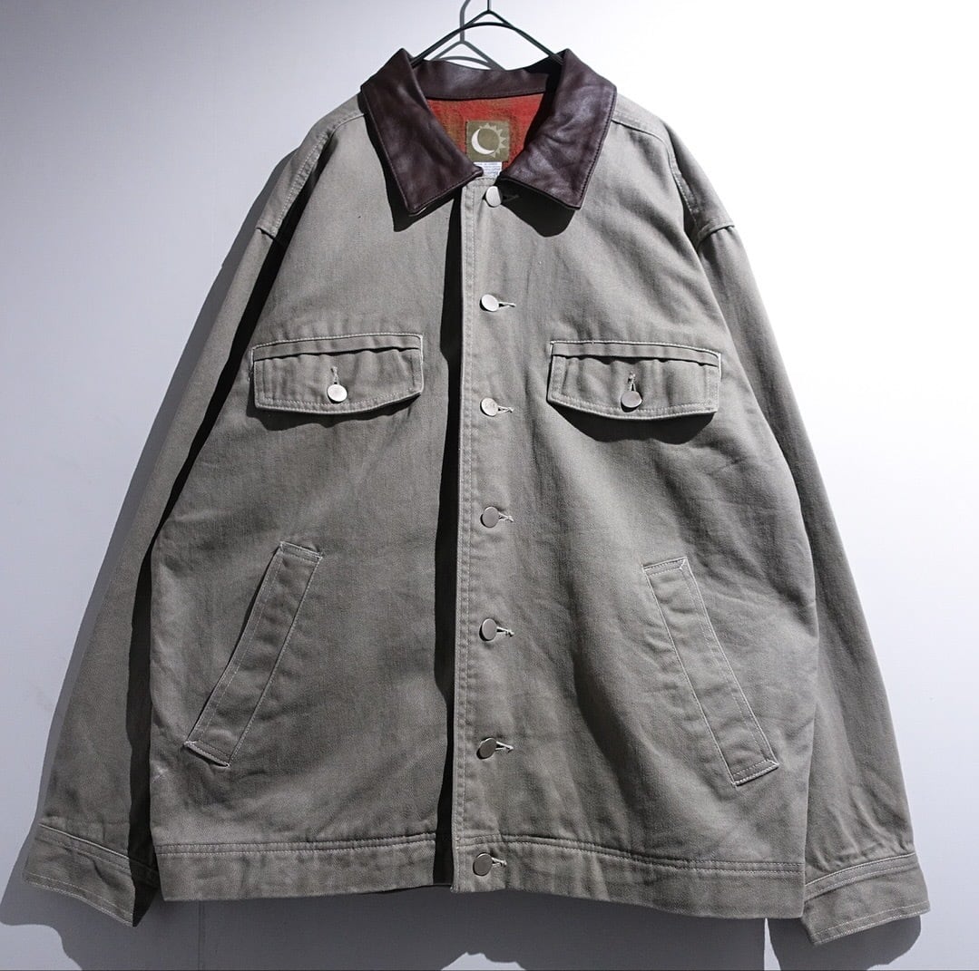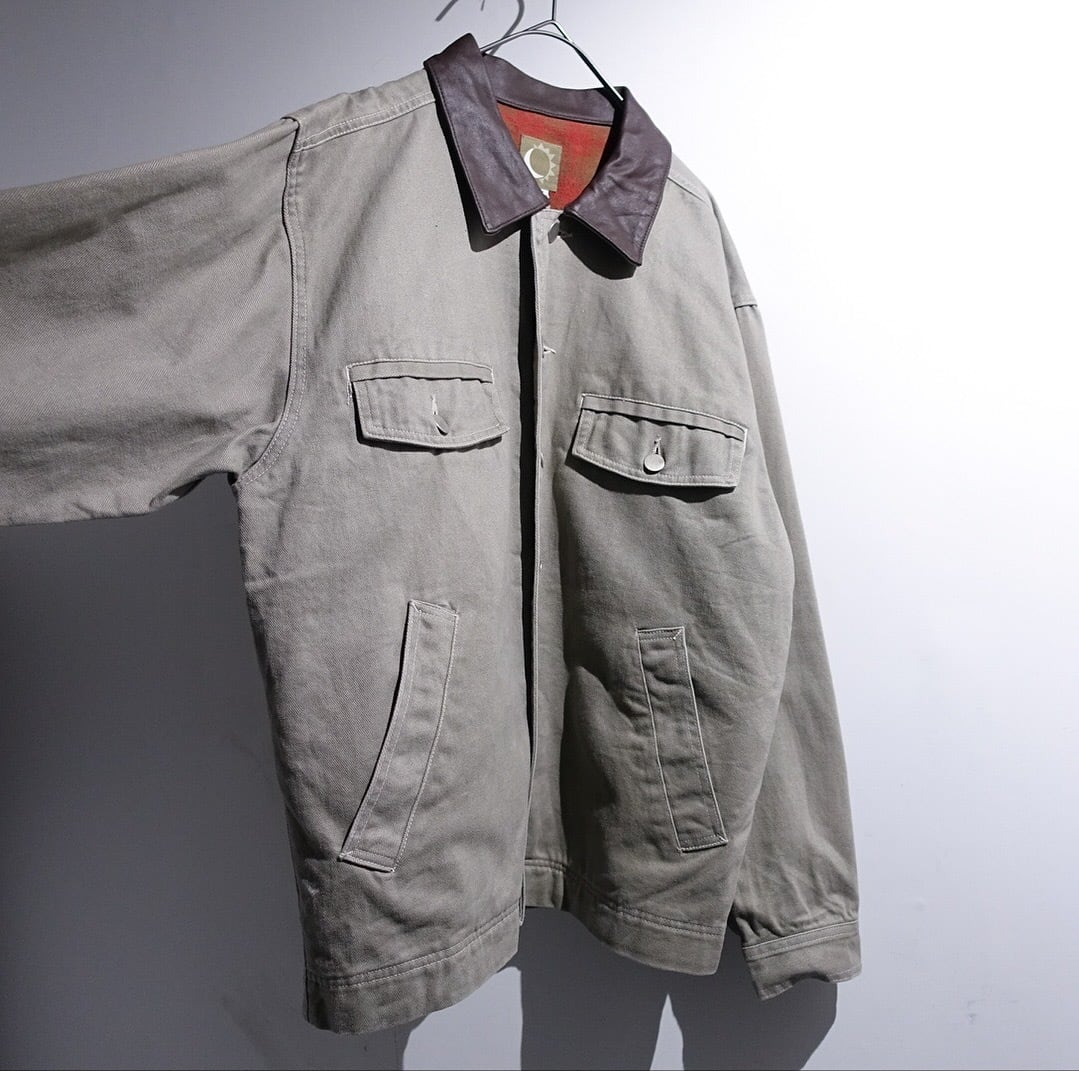 90s Khaki 4-Pocket & Leather Collar Ombre check lining Canvas Jacket