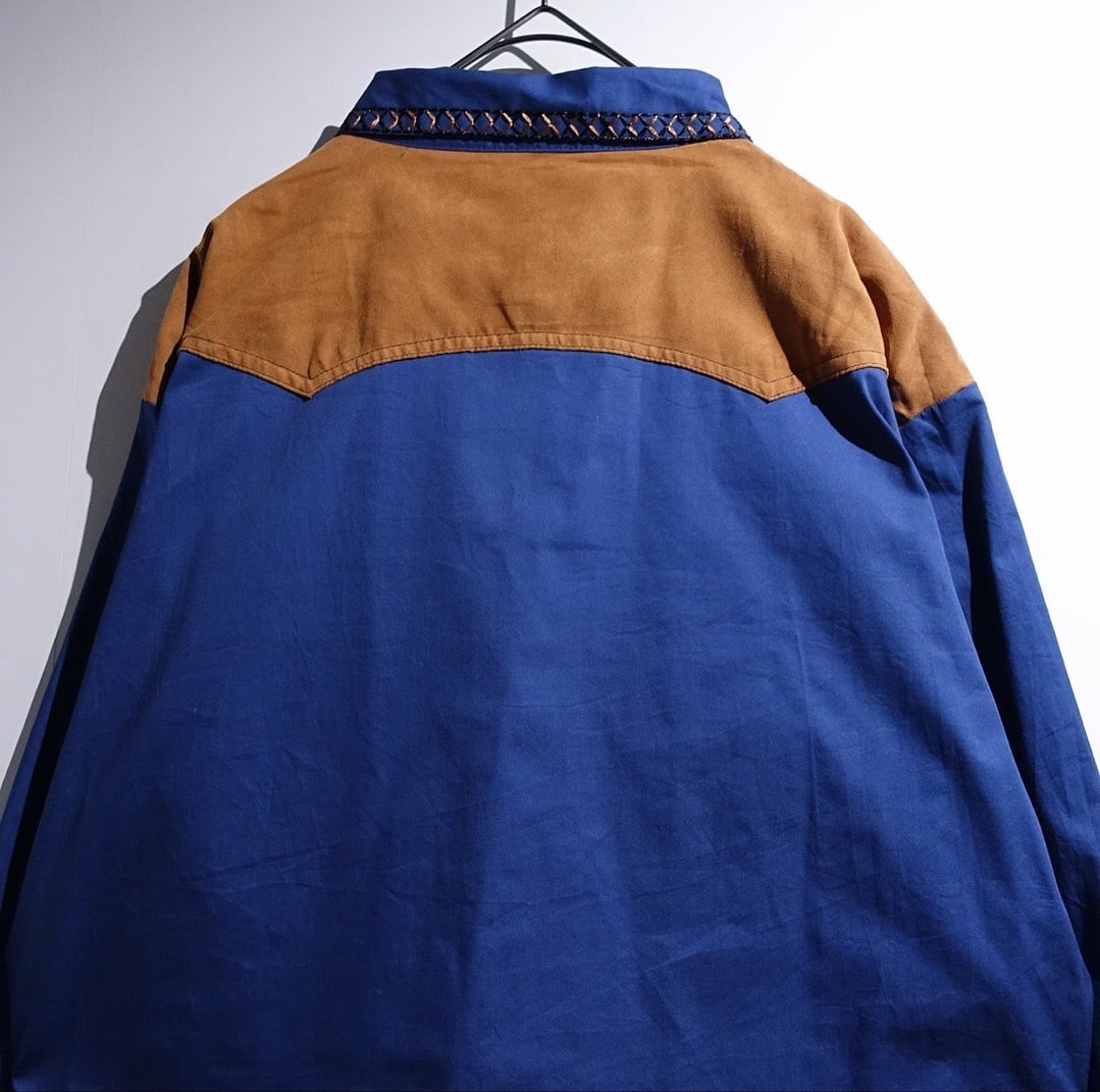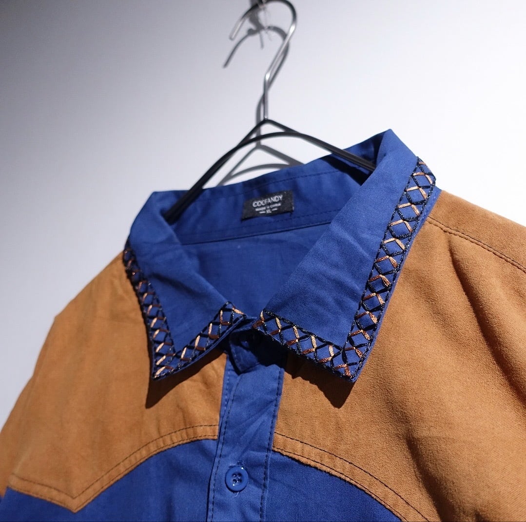 Blue Peach Skin Switching & Embroidery Design Western Shirt