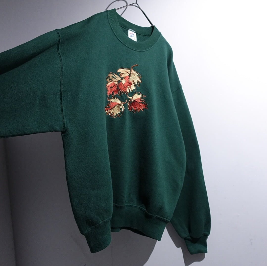 90s "JERZEES" Green Fallen Leaves Embroidered Desgin Sweat