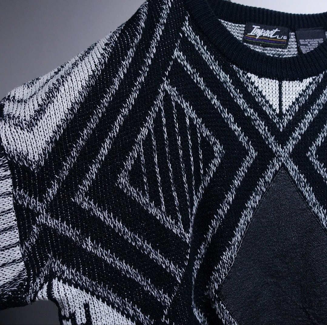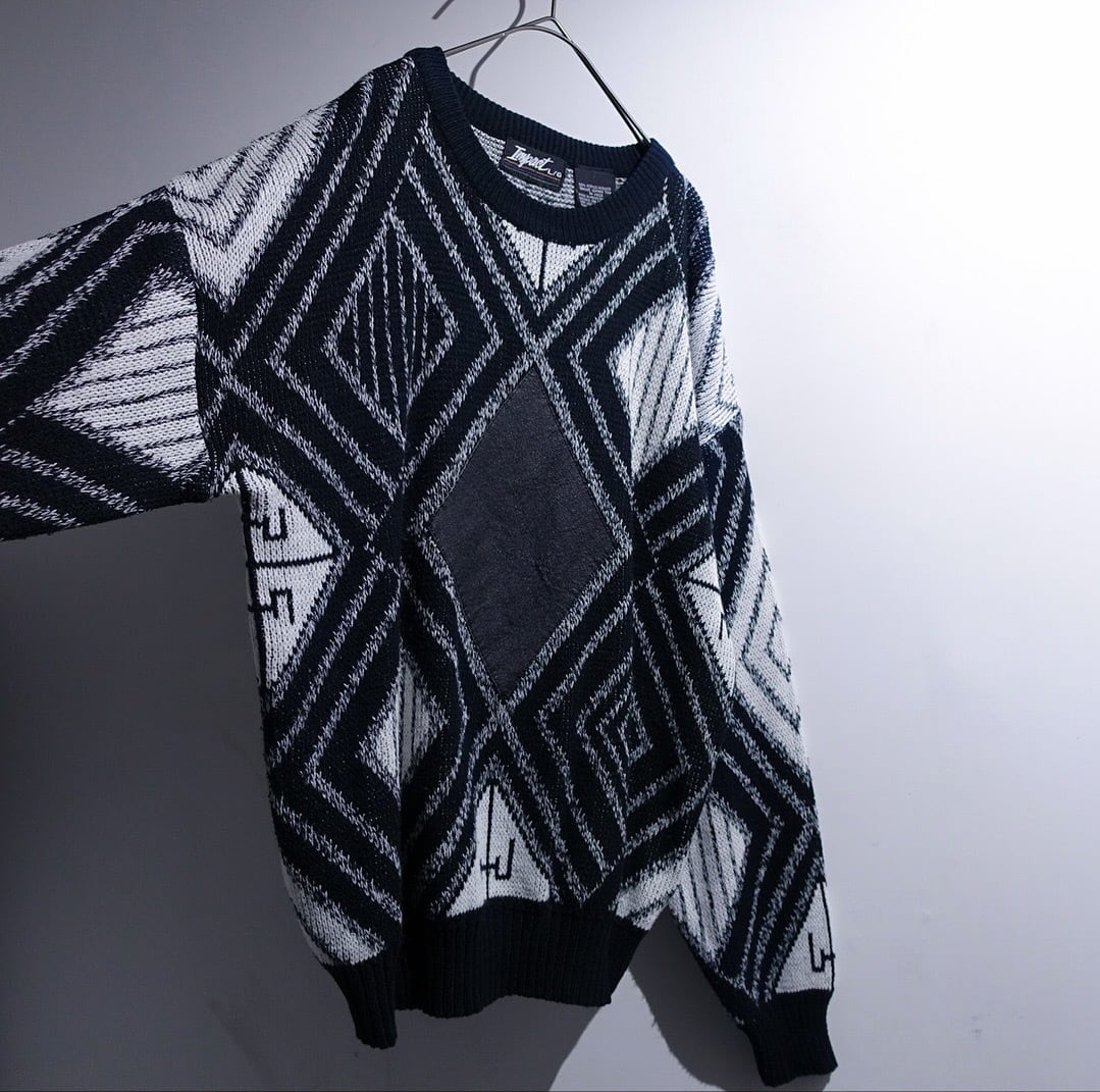 90s Monochrome Geometric Pattern Leather Switch Design Knit