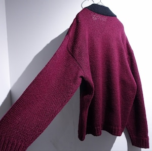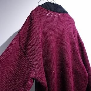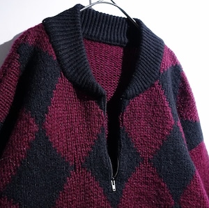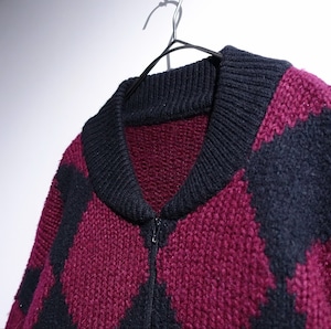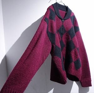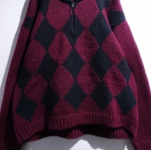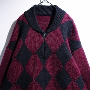 Wine Red & Black Diamond Pattern Desgin Half-Zip Knit