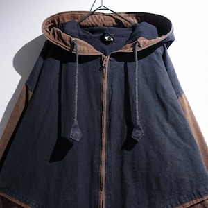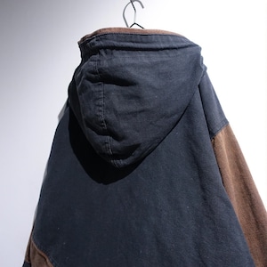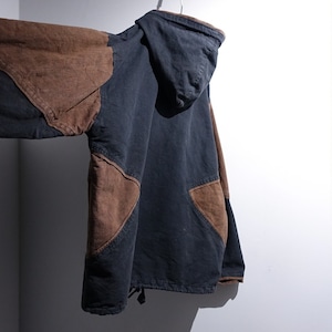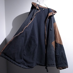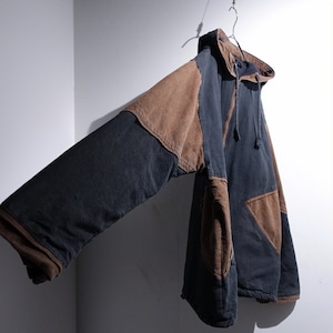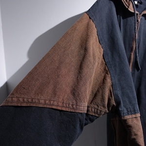 Faded Black x Brown Switching Design Fleece Lined Cotton Hooded Zip Jacket
