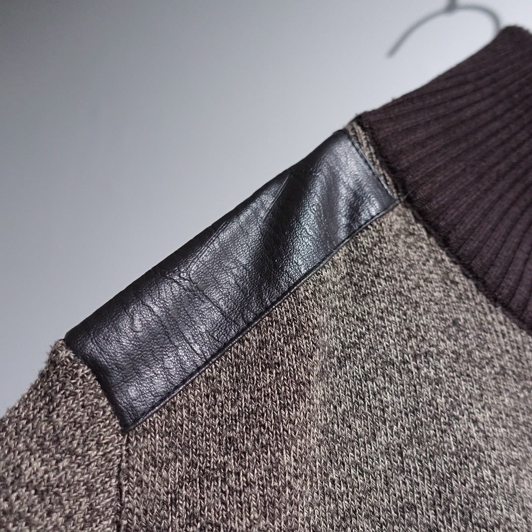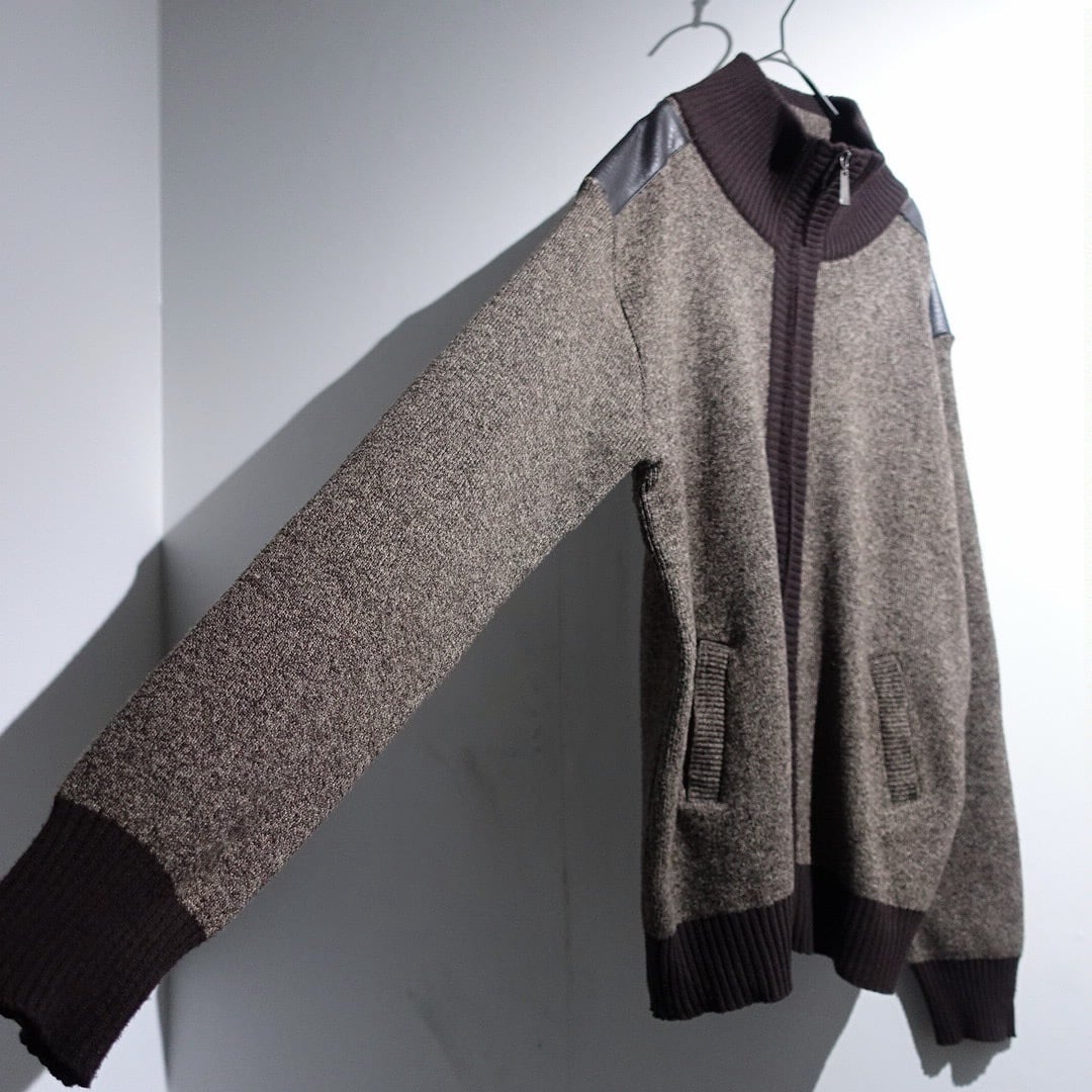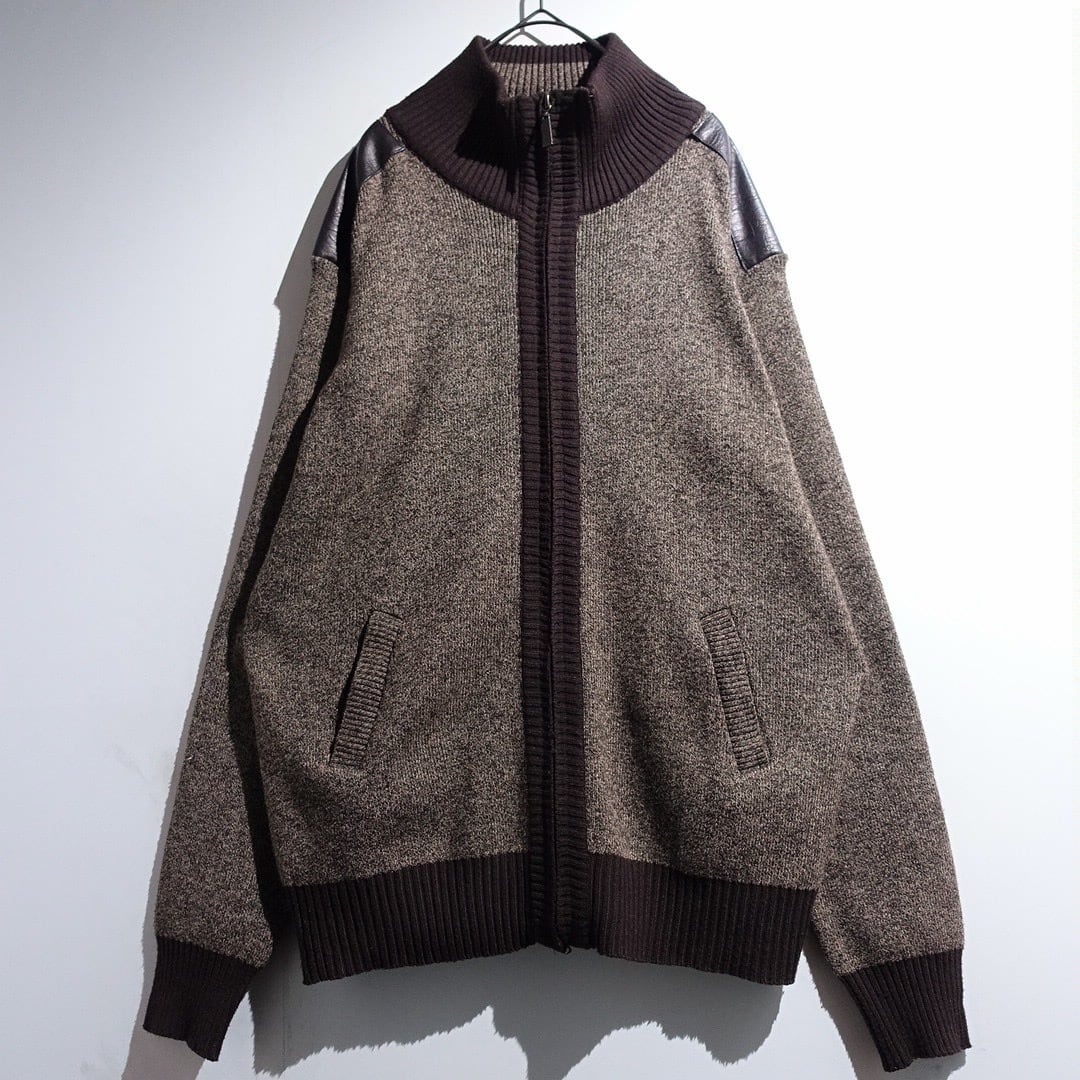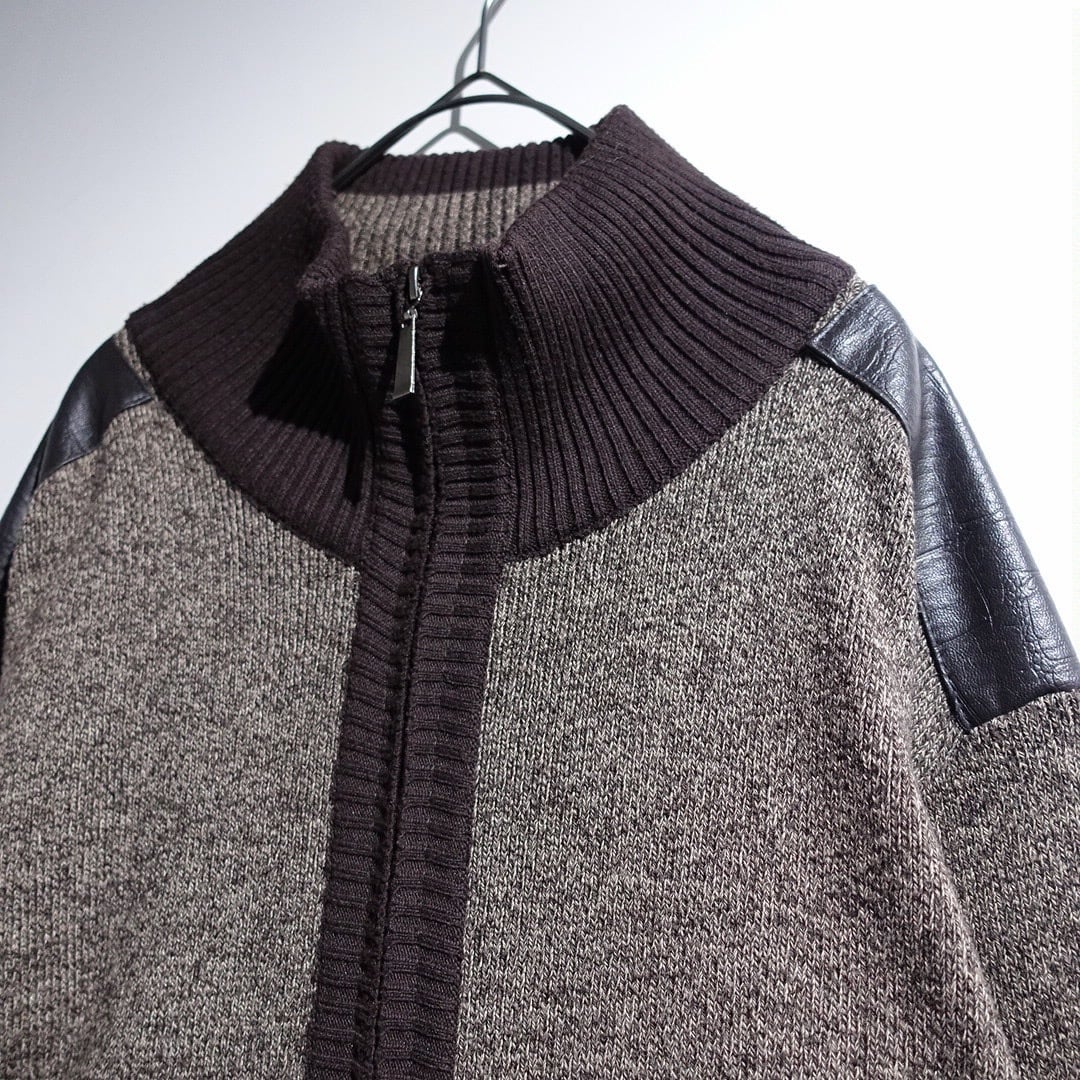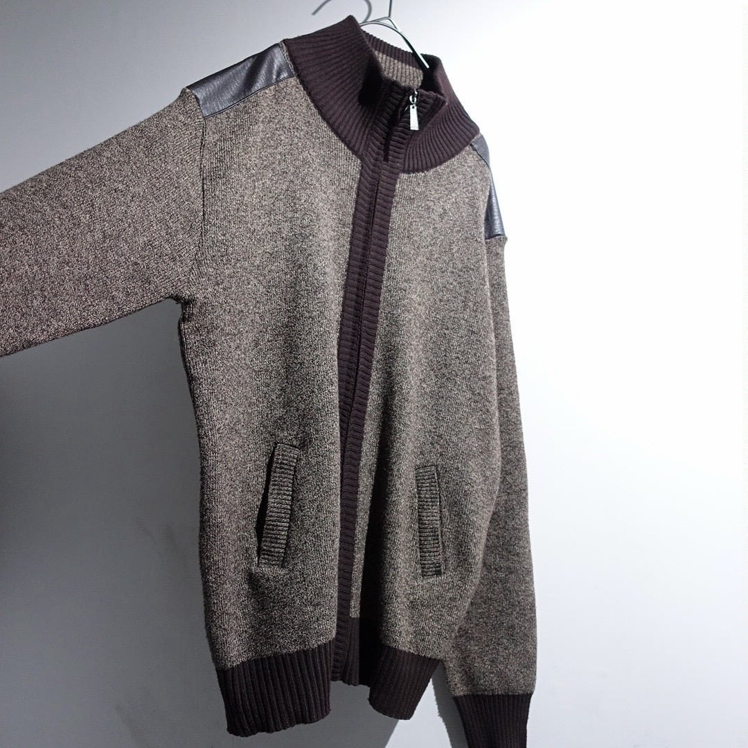 Brown Leather Switching Design Full-Zip Knit