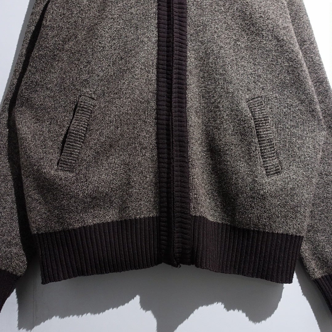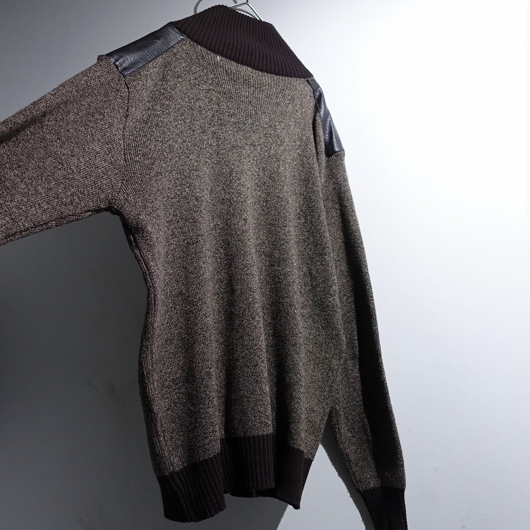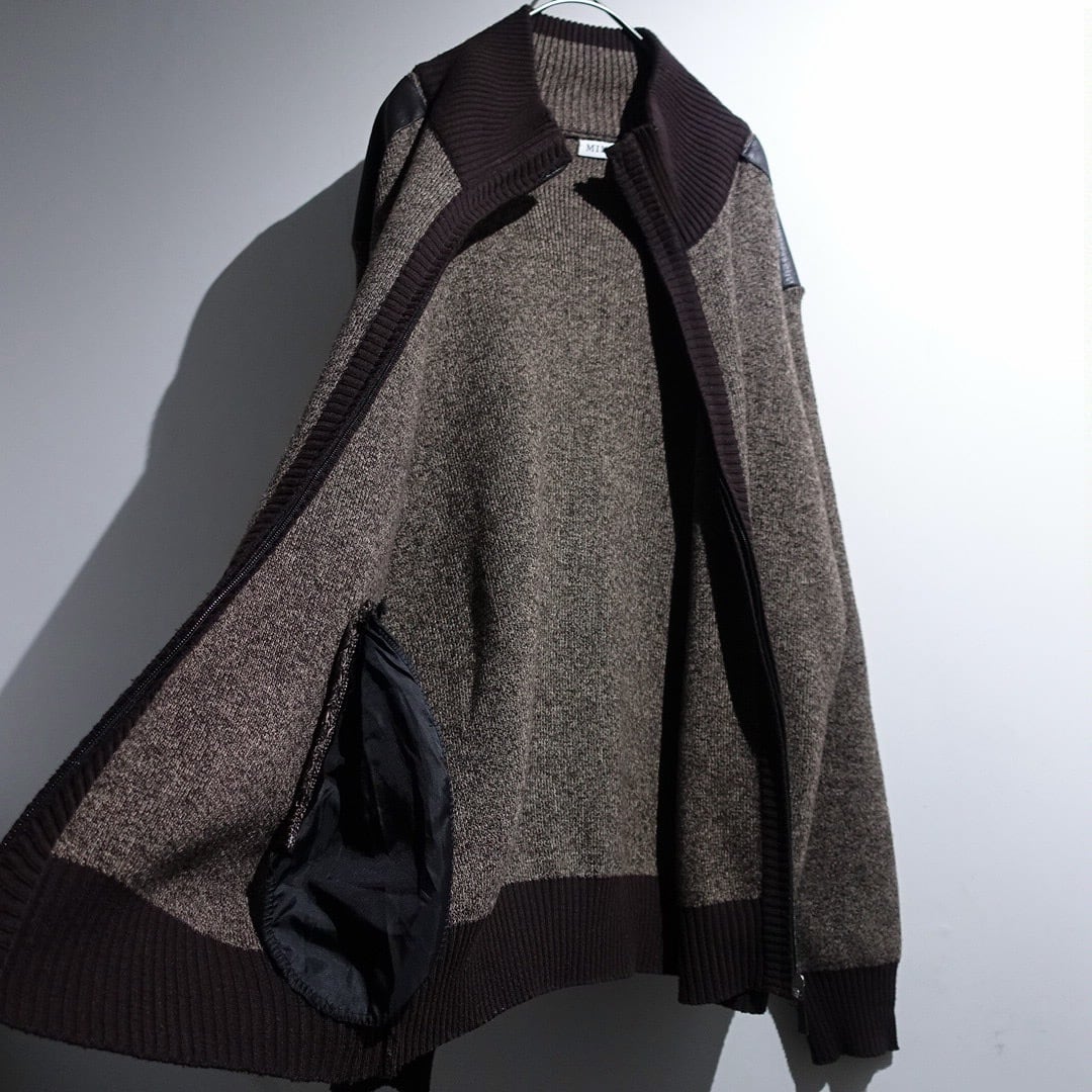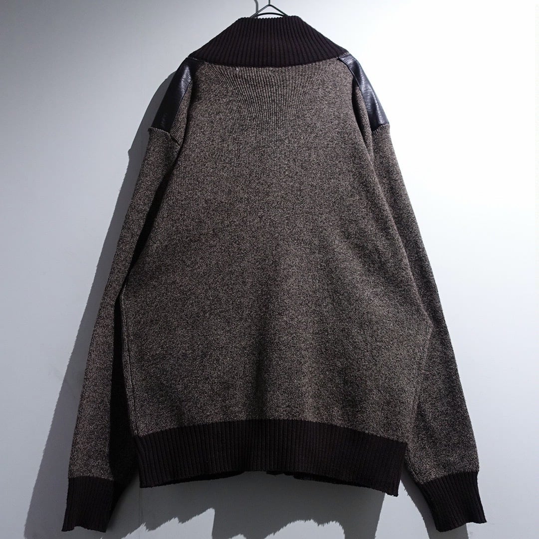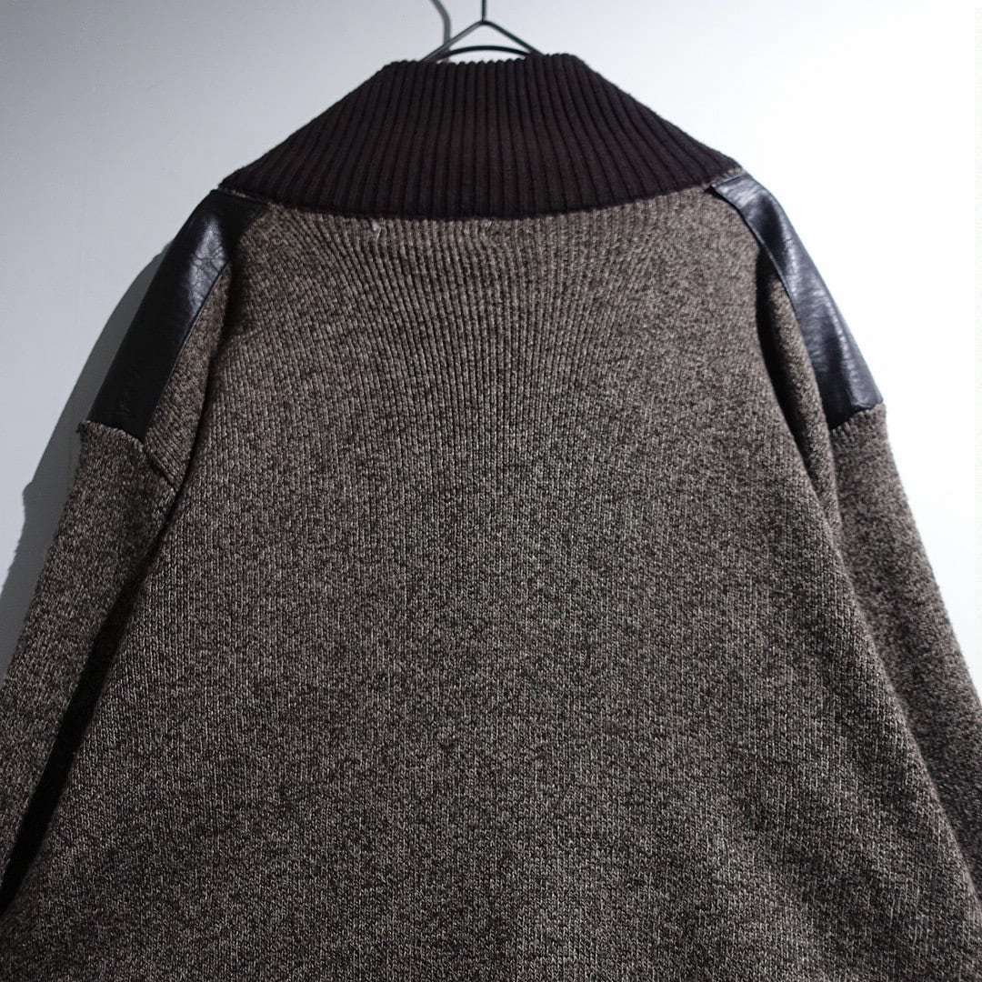 Brown Leather Switching Design Full-Zip Knit