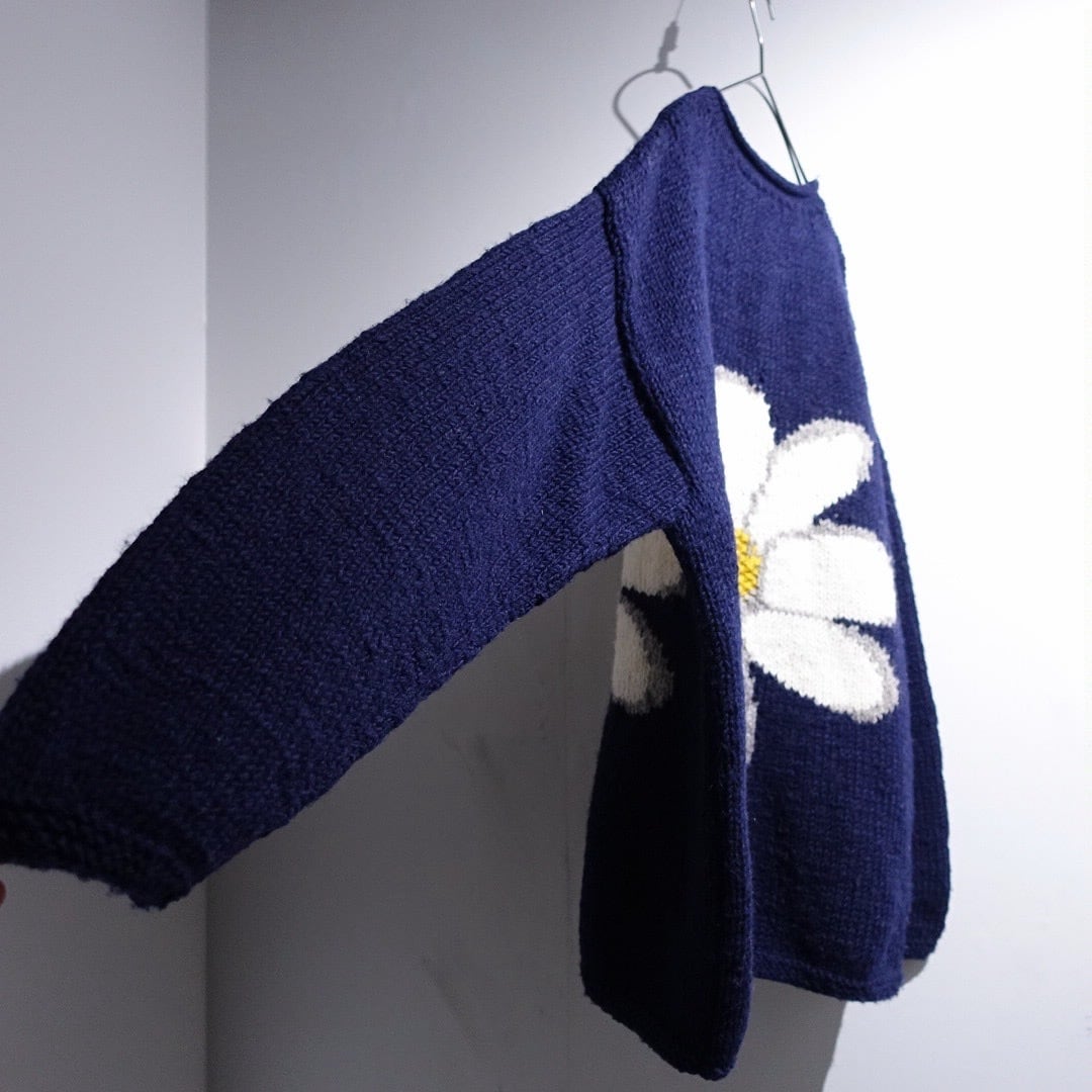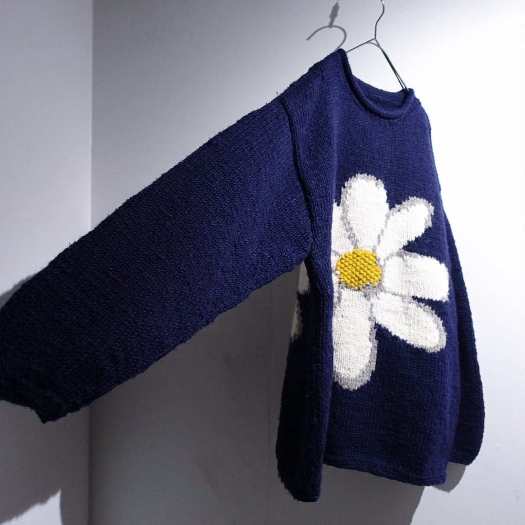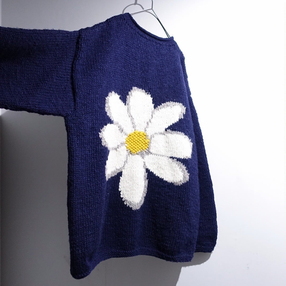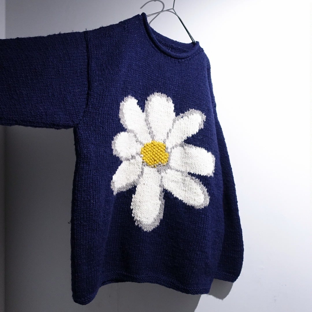 Navy Big Flower Motif Design Wool Ecuador Knit