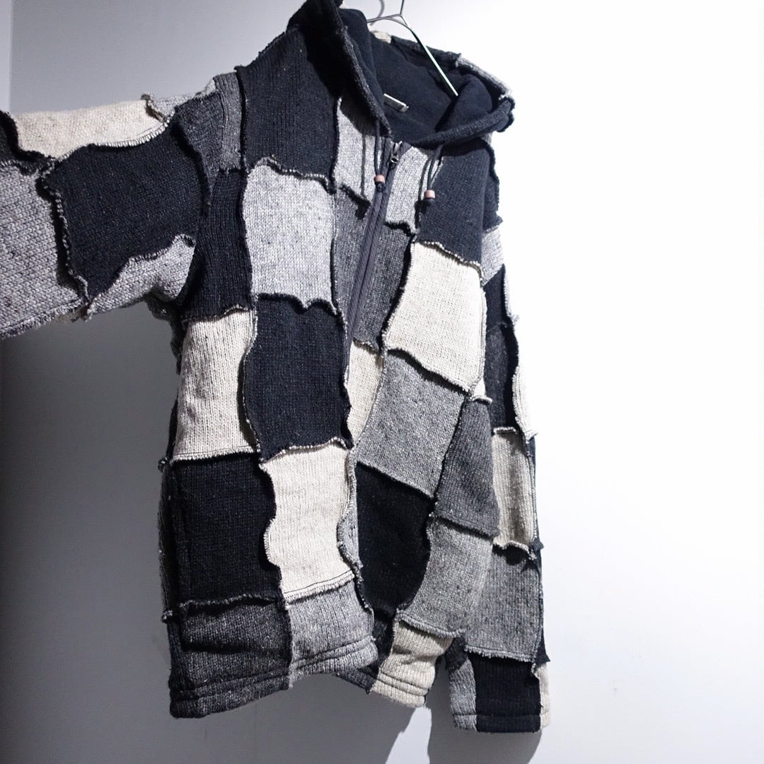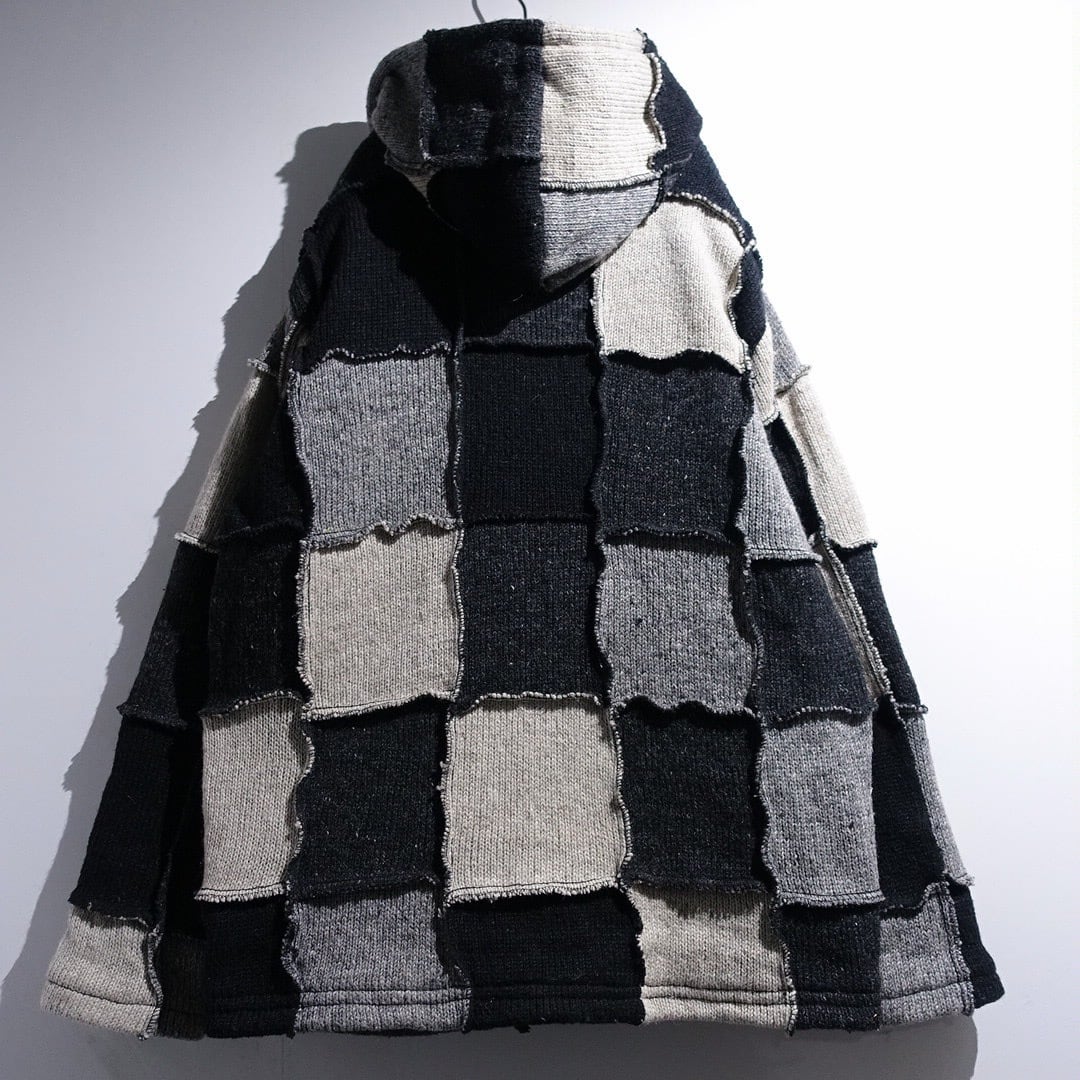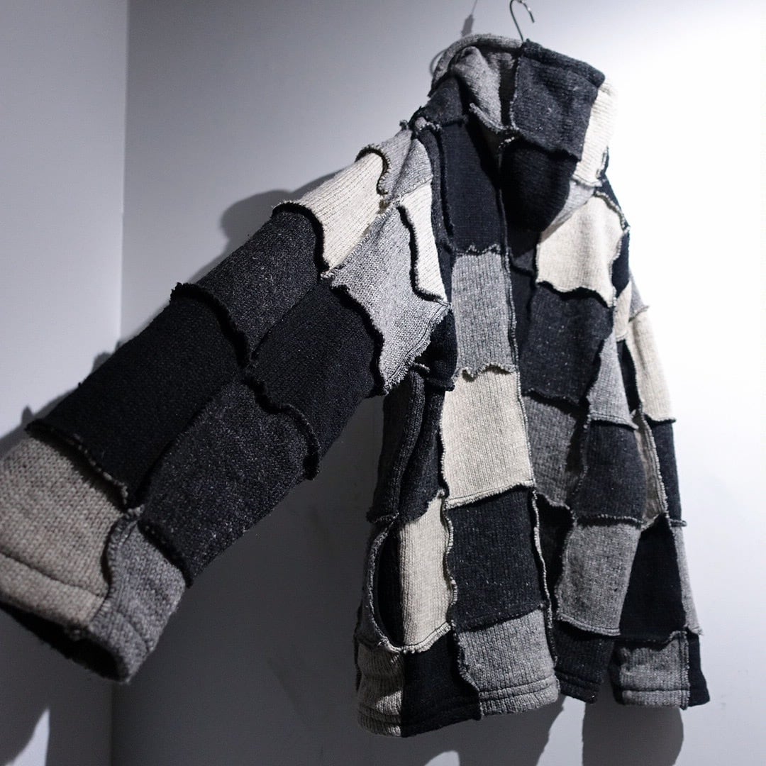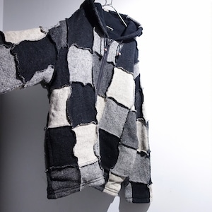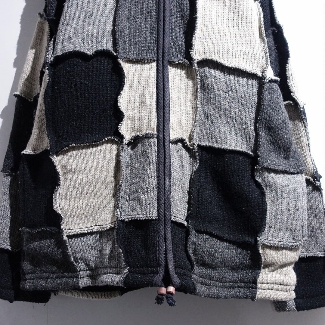 Monotone Patchwork 3D Design Wool Knit Zip Parka