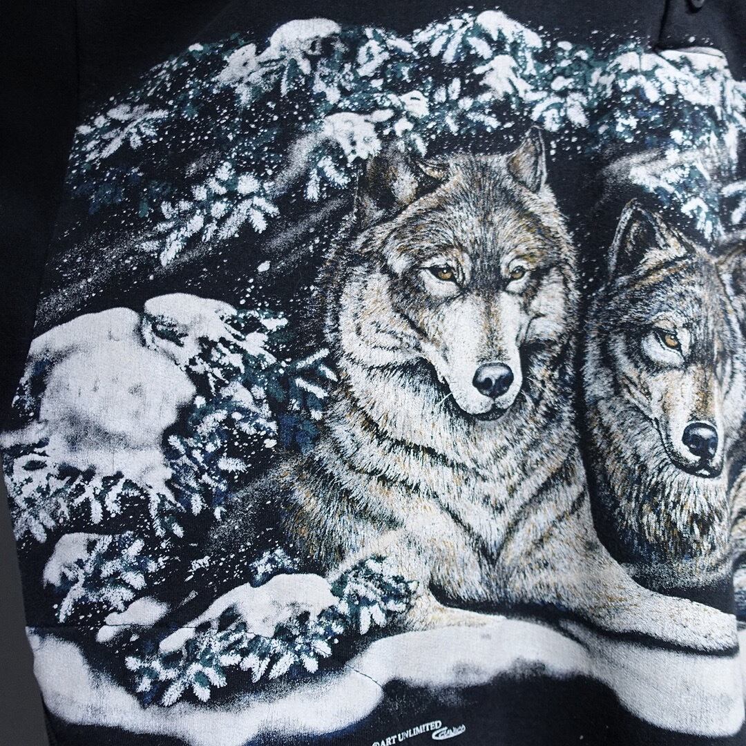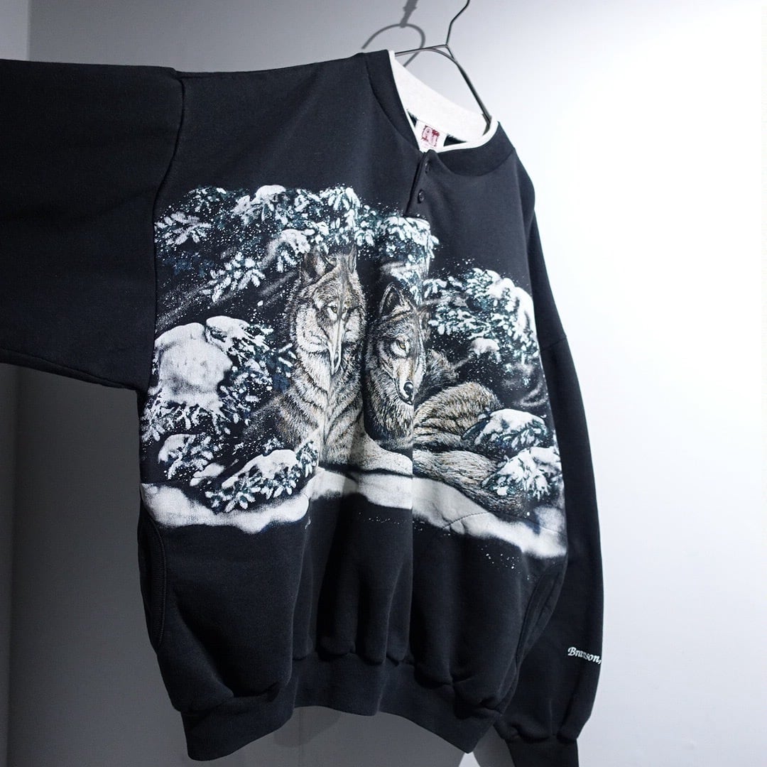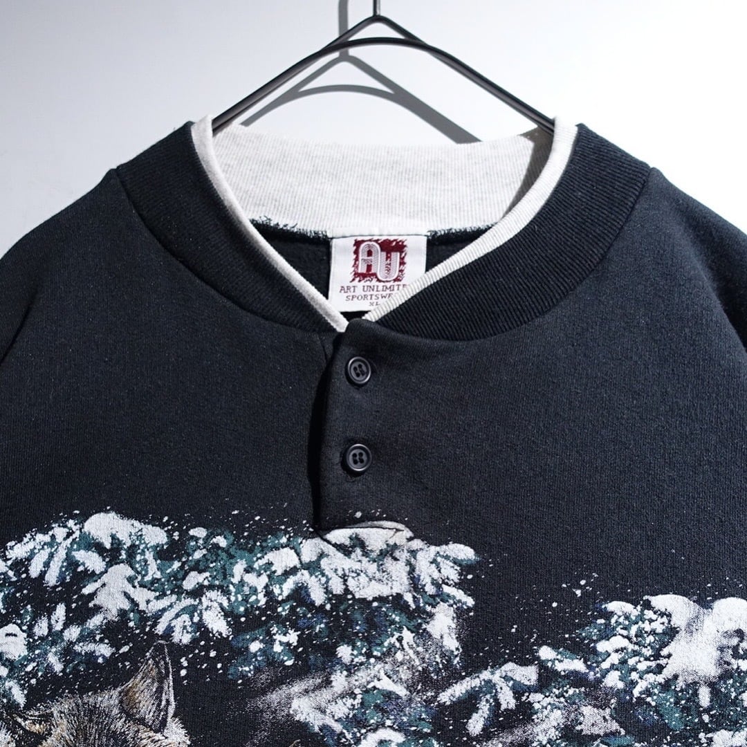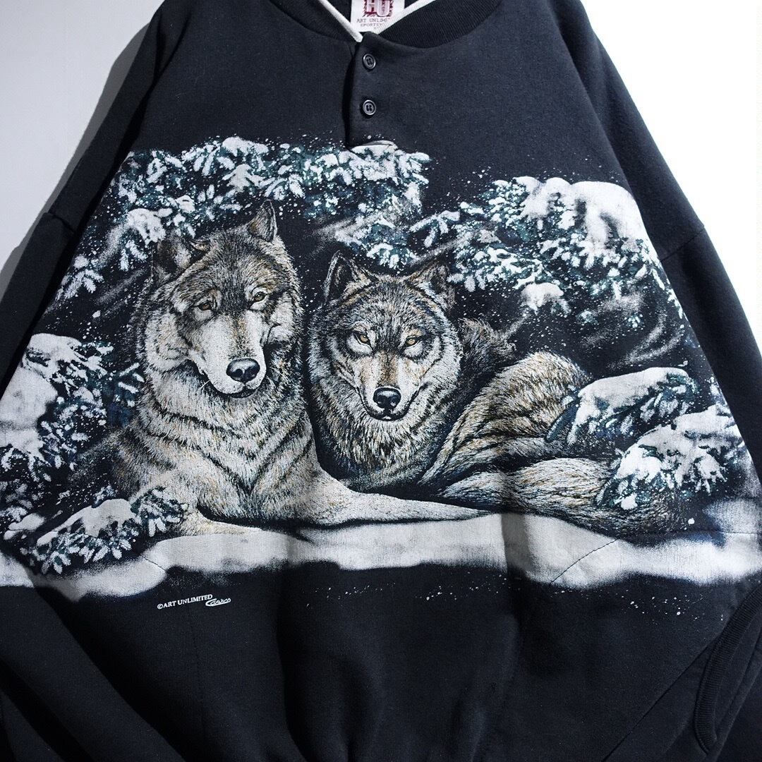 90s "ART UNLIMITED" Black Wolf Print Design Henley Neck Sweat