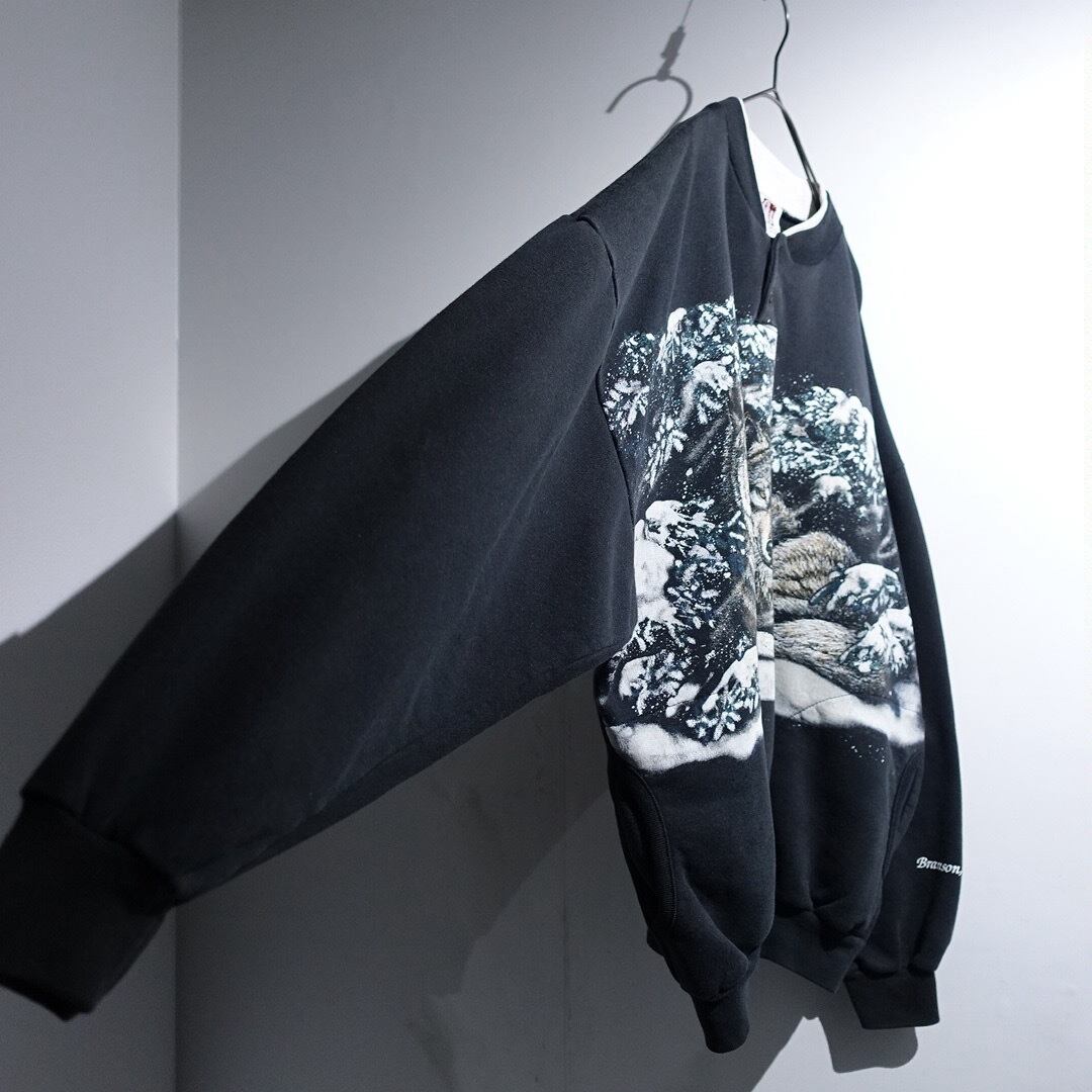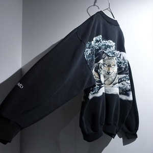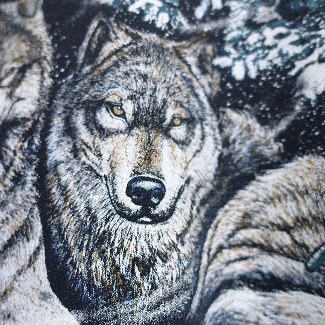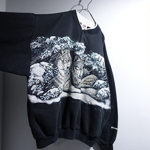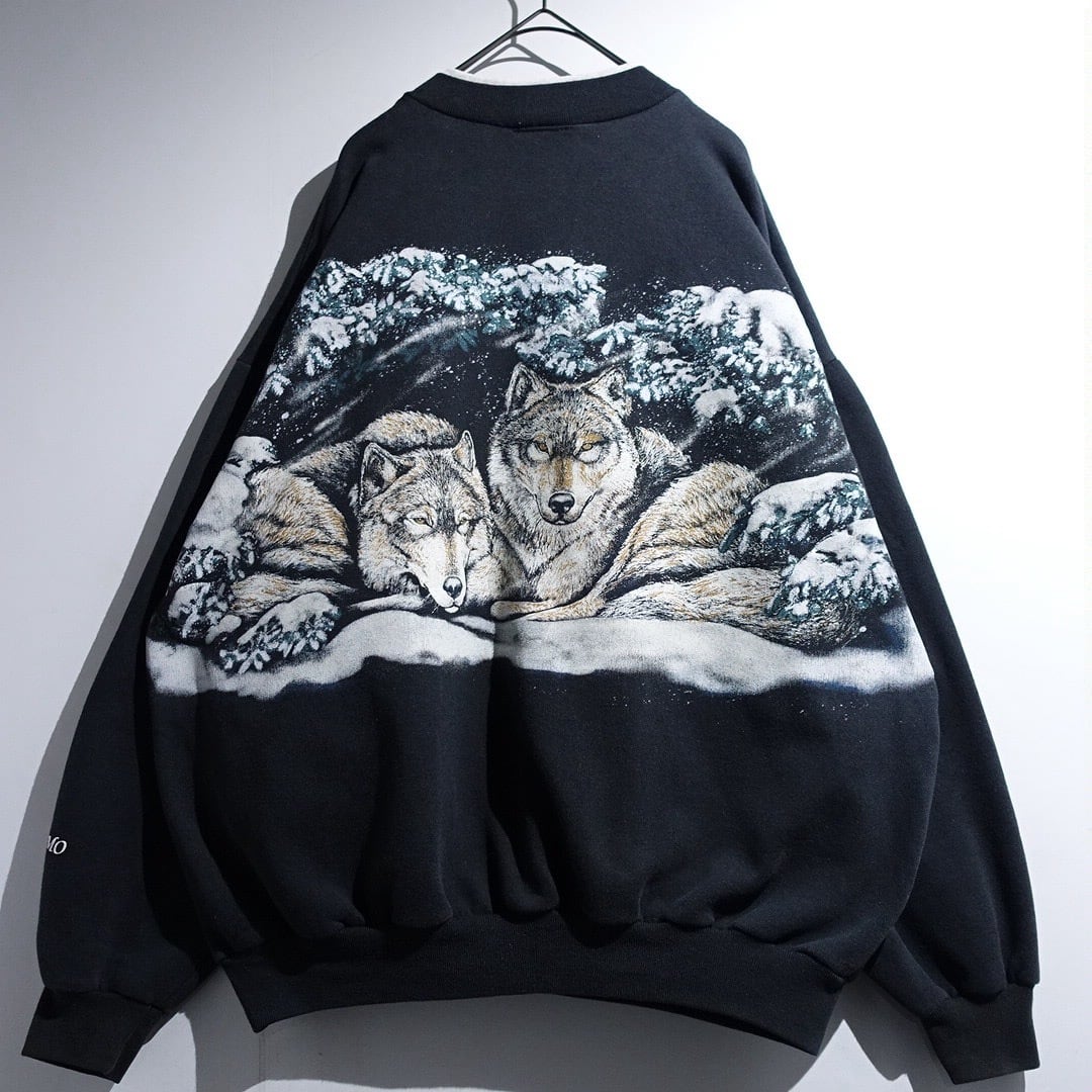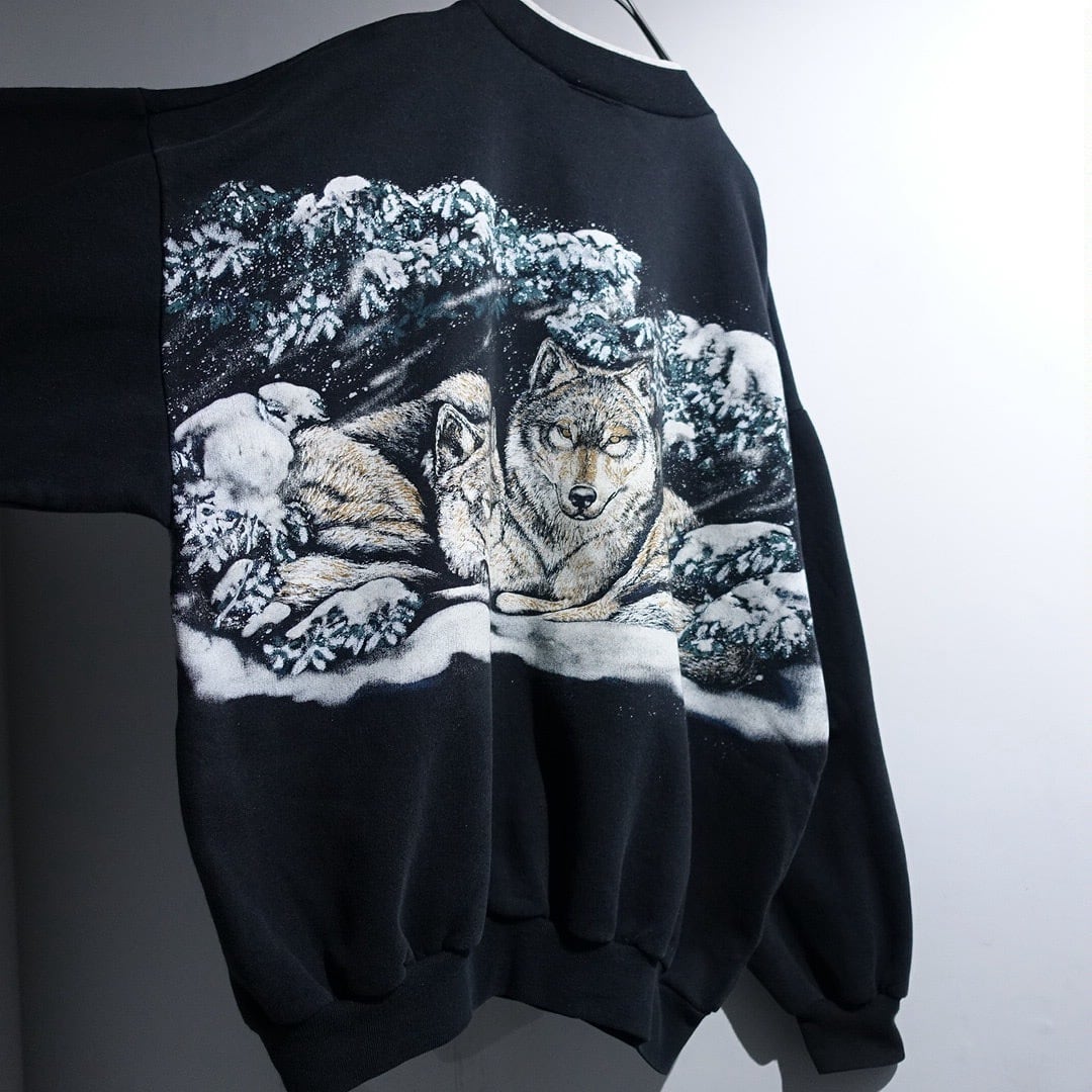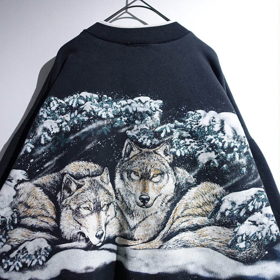 90s "ART UNLIMITED" Black Wolf Print Design Henley Neck Sweat