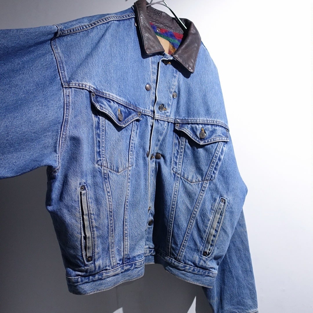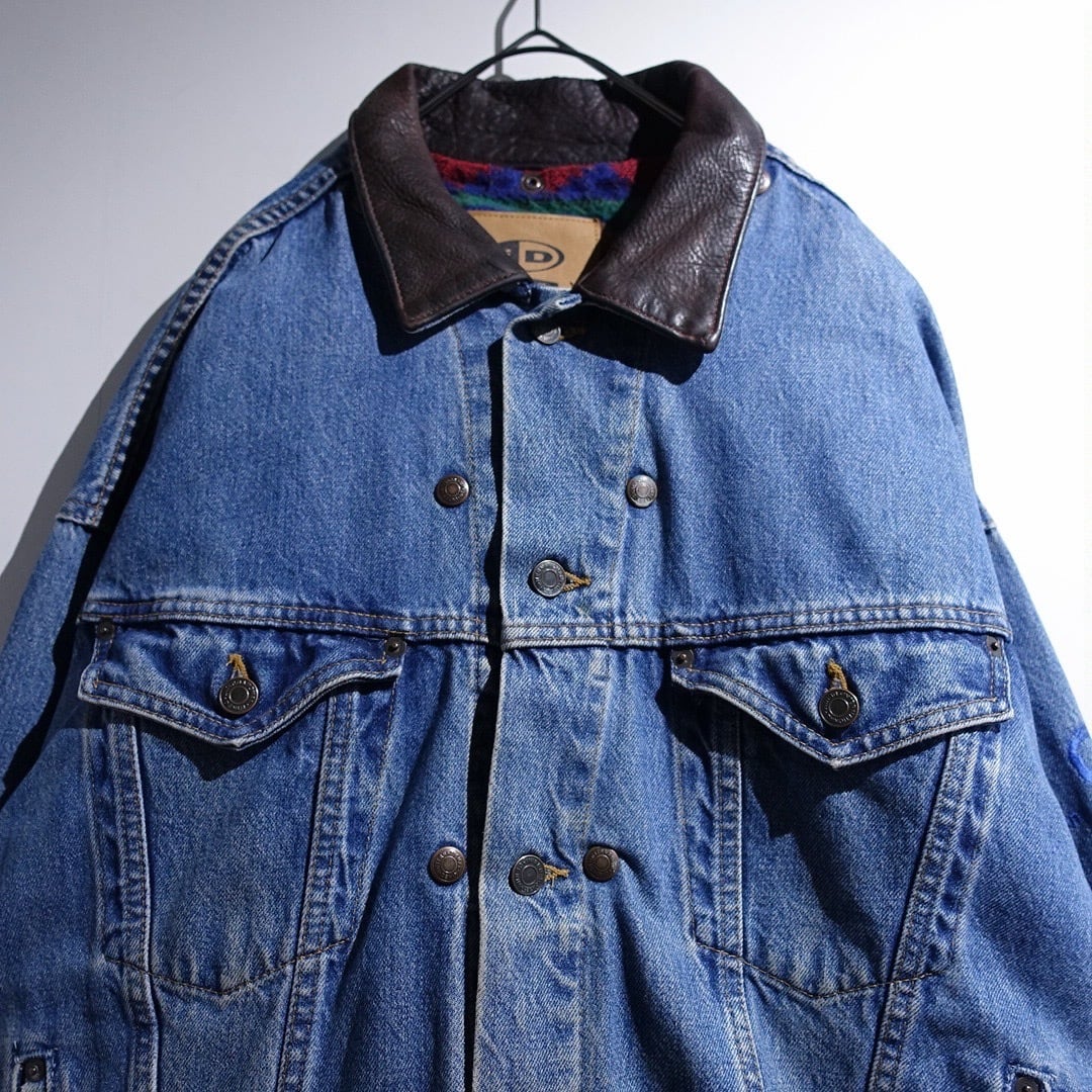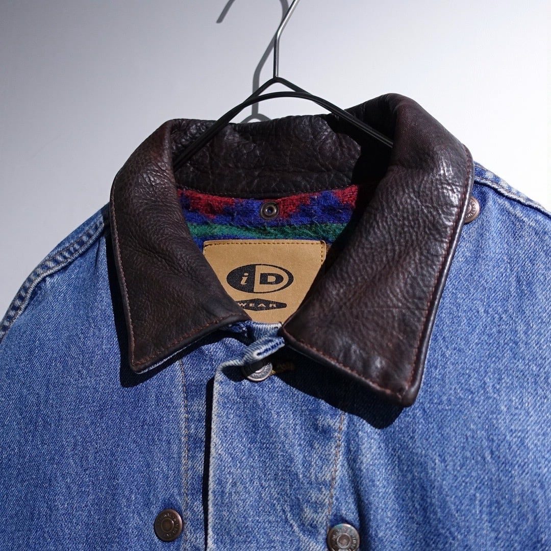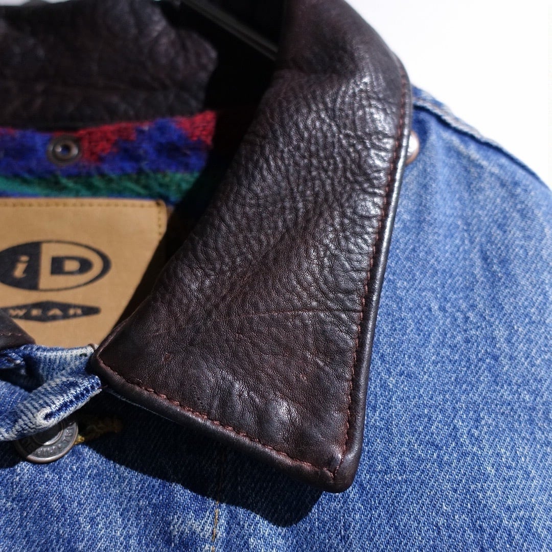"iD" Denim Leather Collar Switching Design Trucker Jacket with Liner