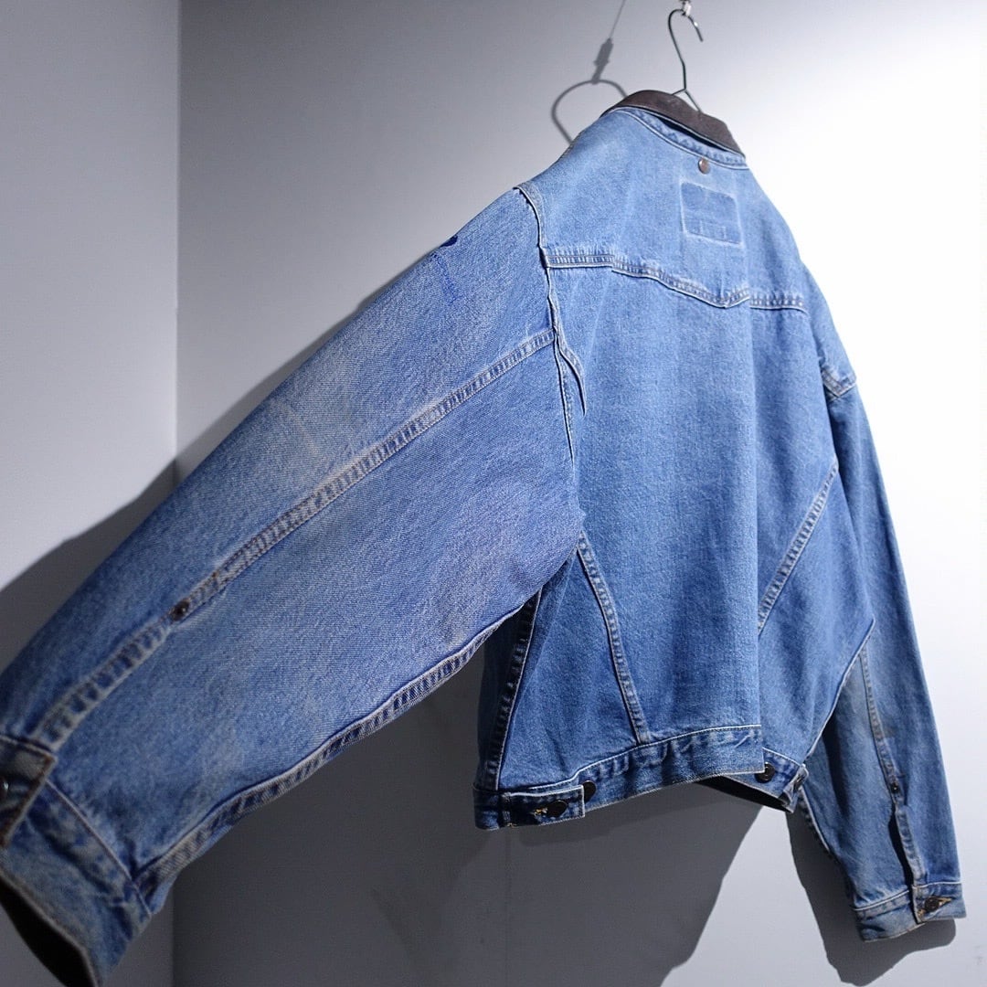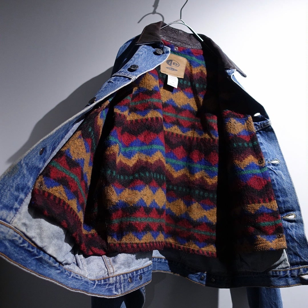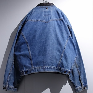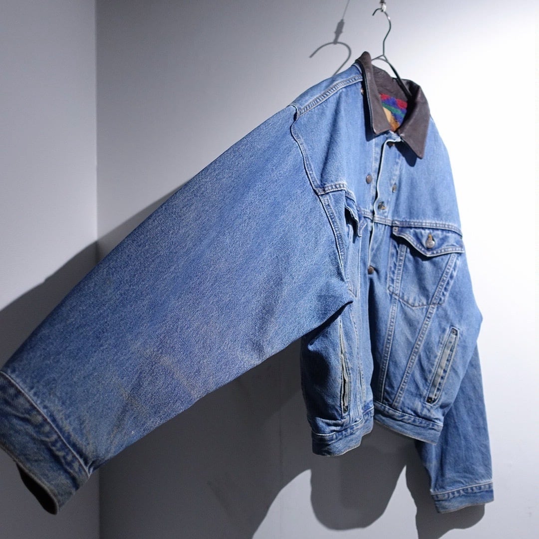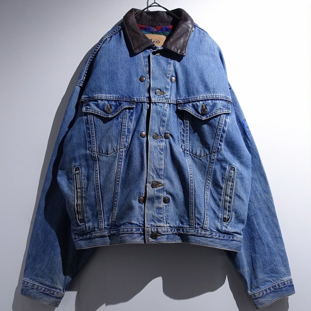 "iD" Denim Leather Collar Switching Design Trucker Jacket with Liner