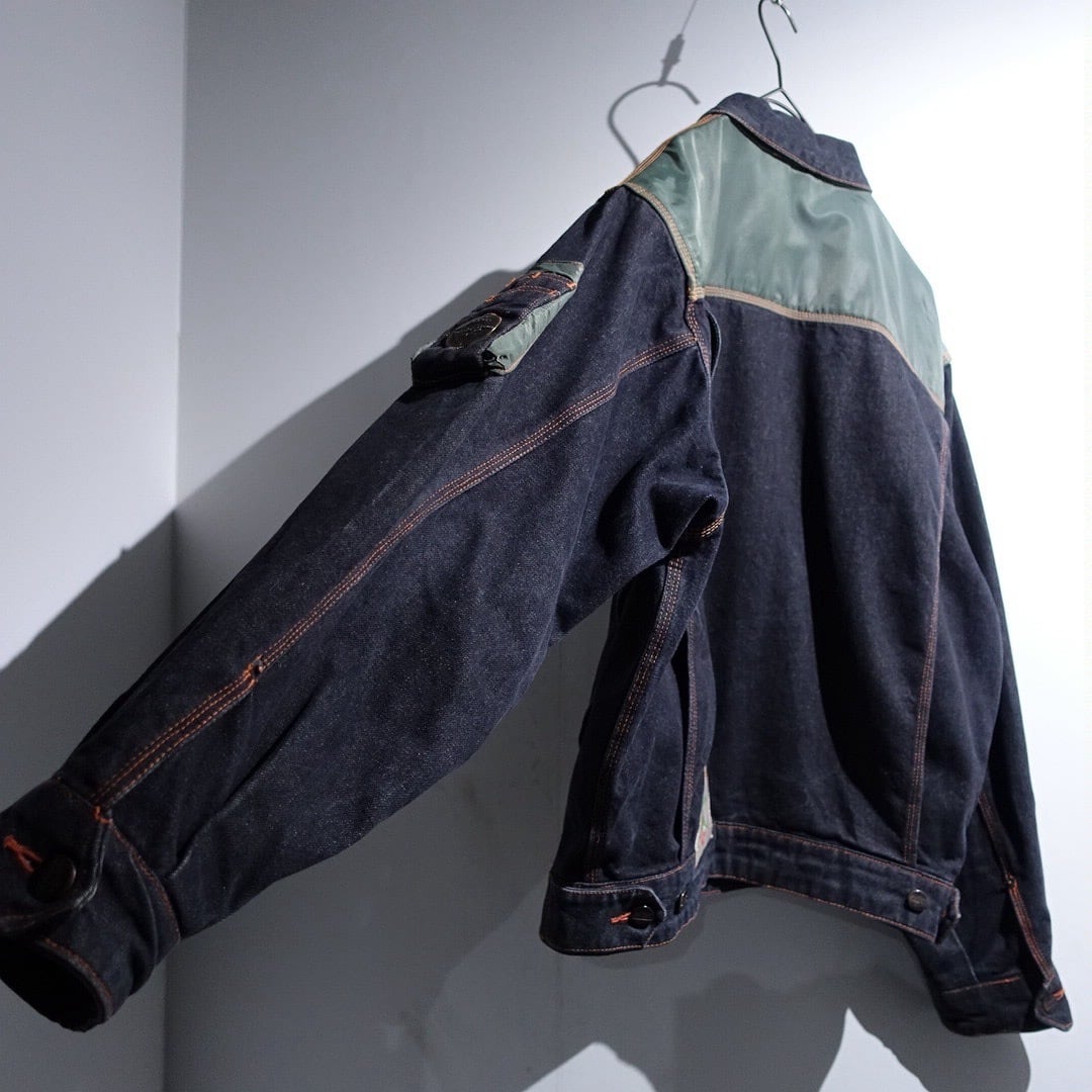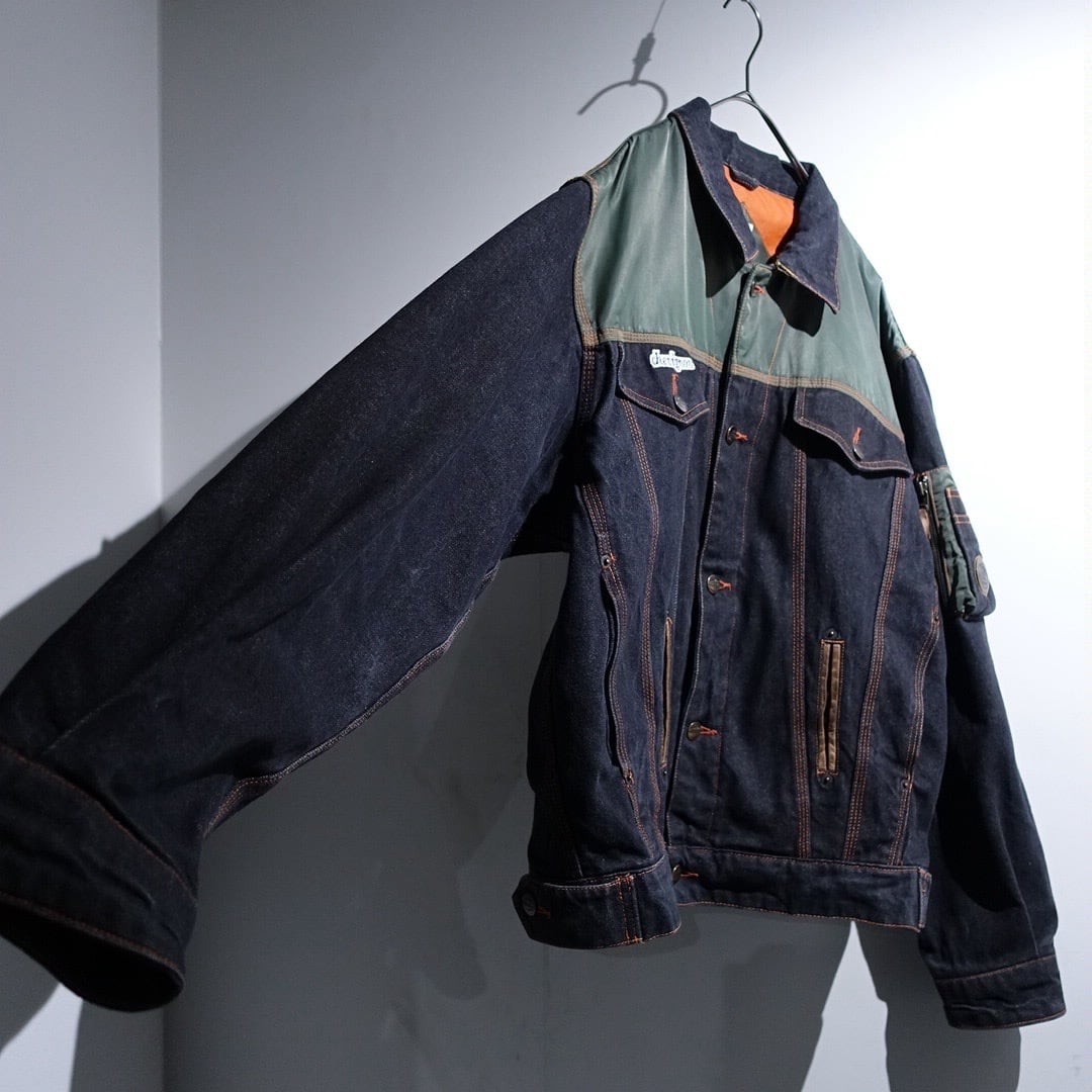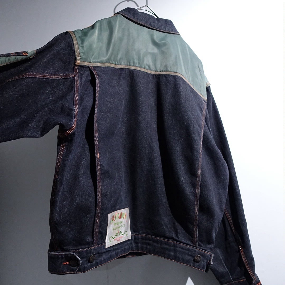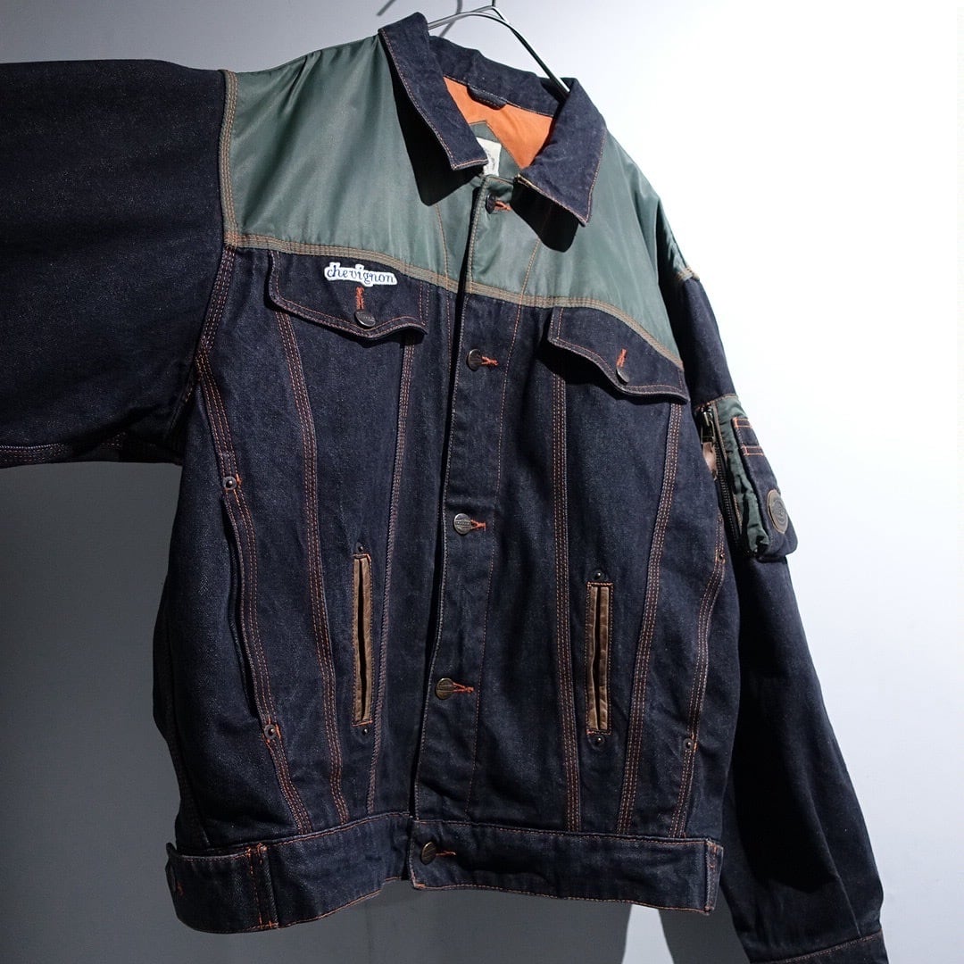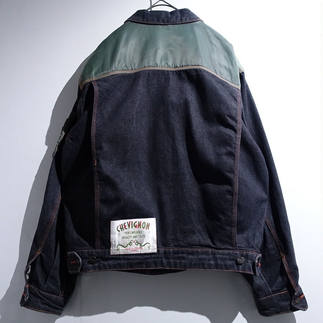 90s EURO "CHEVIGNON" Black Denim & Nylon Switching Design Jacket