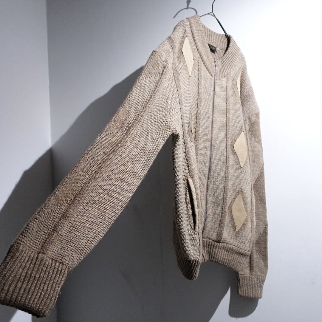 EURO Brown Leather Diamond Switching Design Knit Zip Blouson