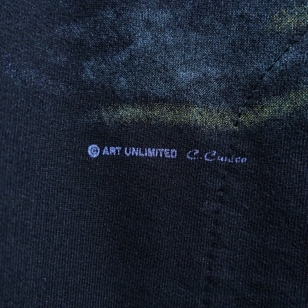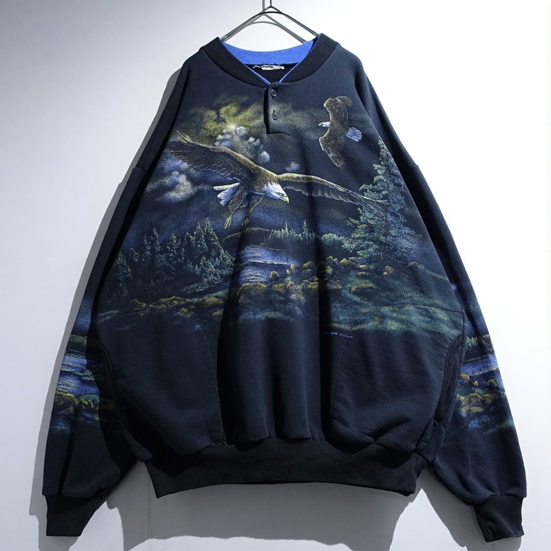 90s "ART UNLIMITED" Black Eagle Landscape All-Over Print Design Henley Neck Sweat