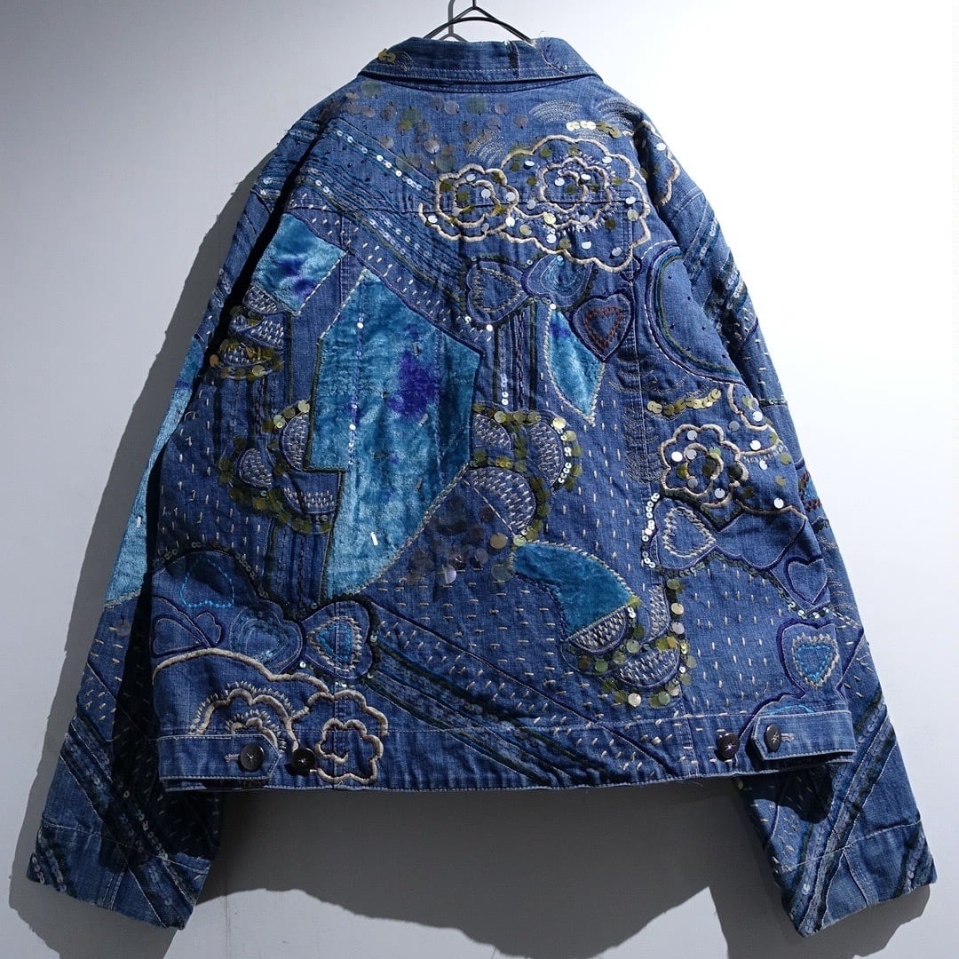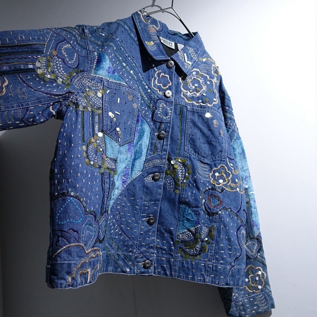 90s "Chico's" Denim Sequin Fur Embroidery Patchwork Design Trucker Jacket