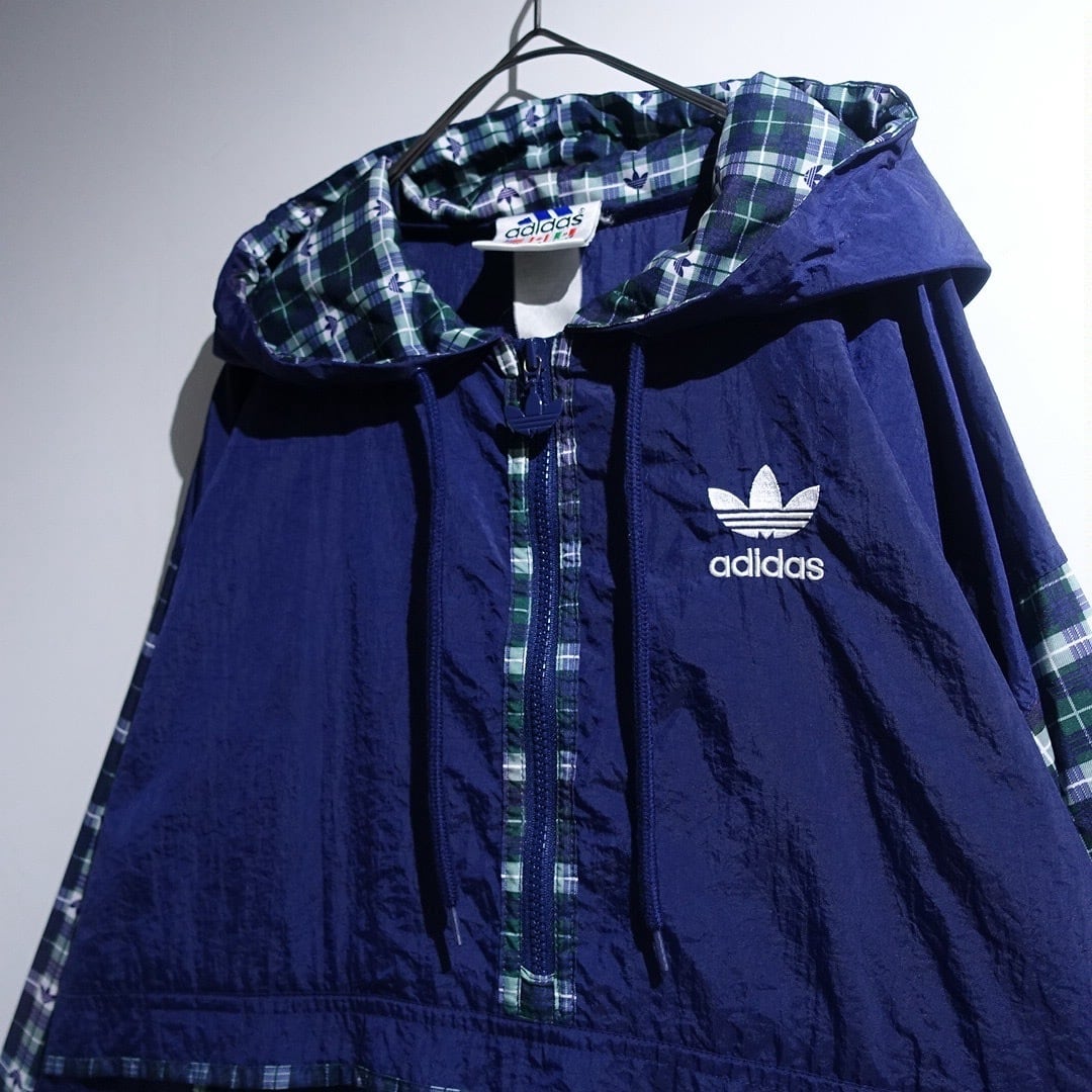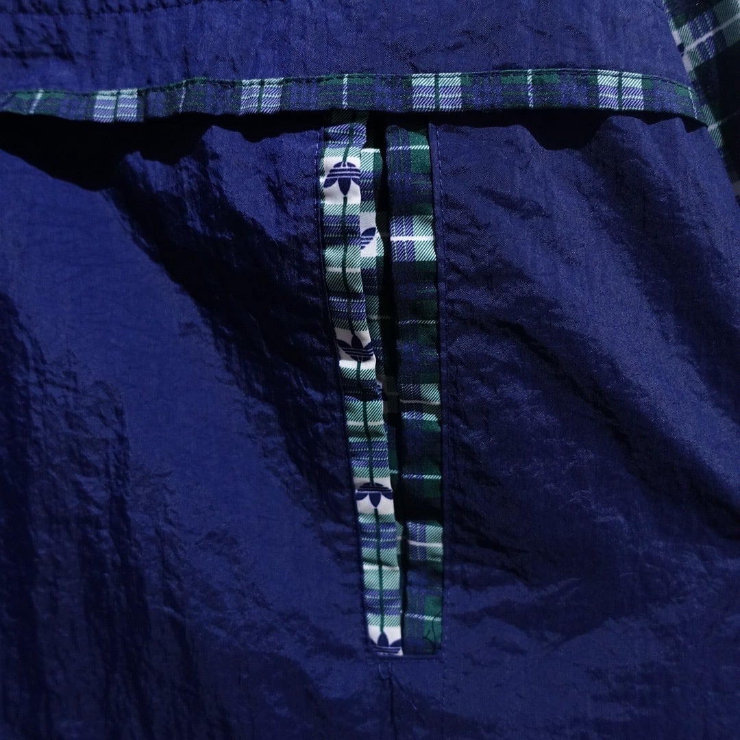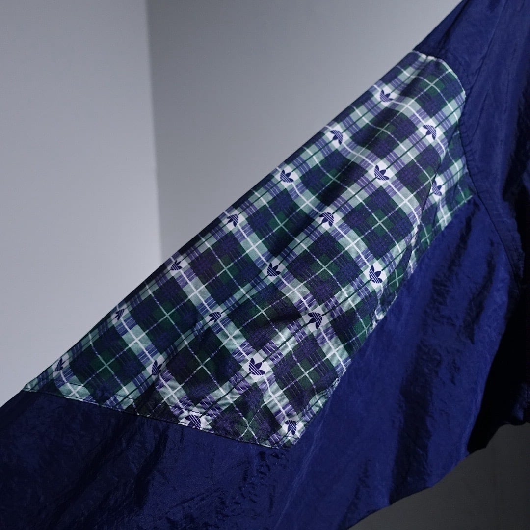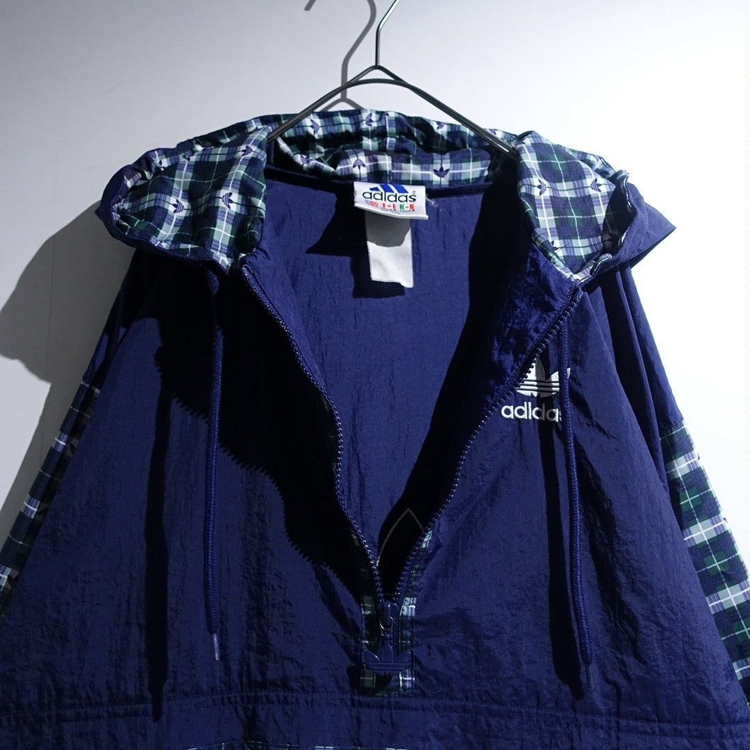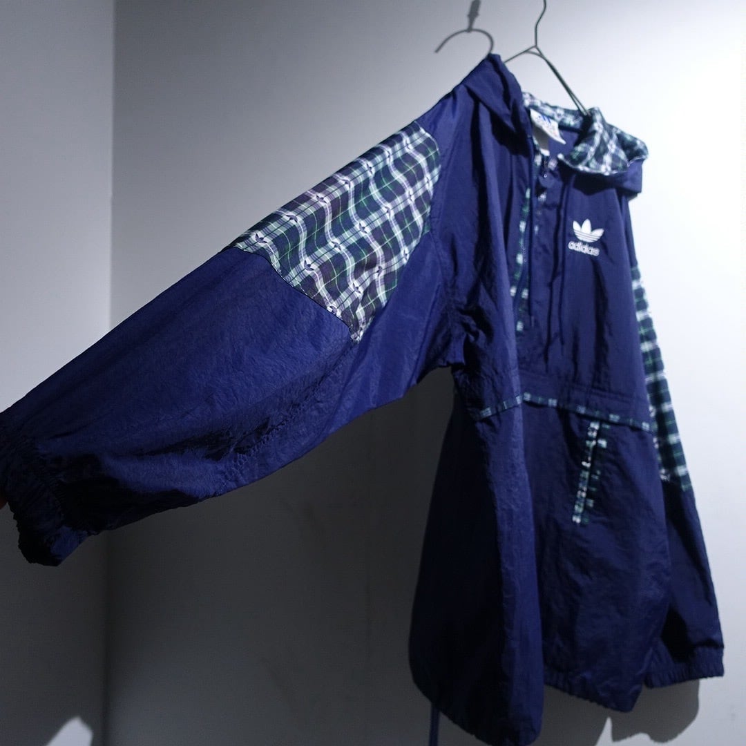 90s "adidas" Navy Logo Check Switching Half-Zip Design Nylon Anorak Jacket