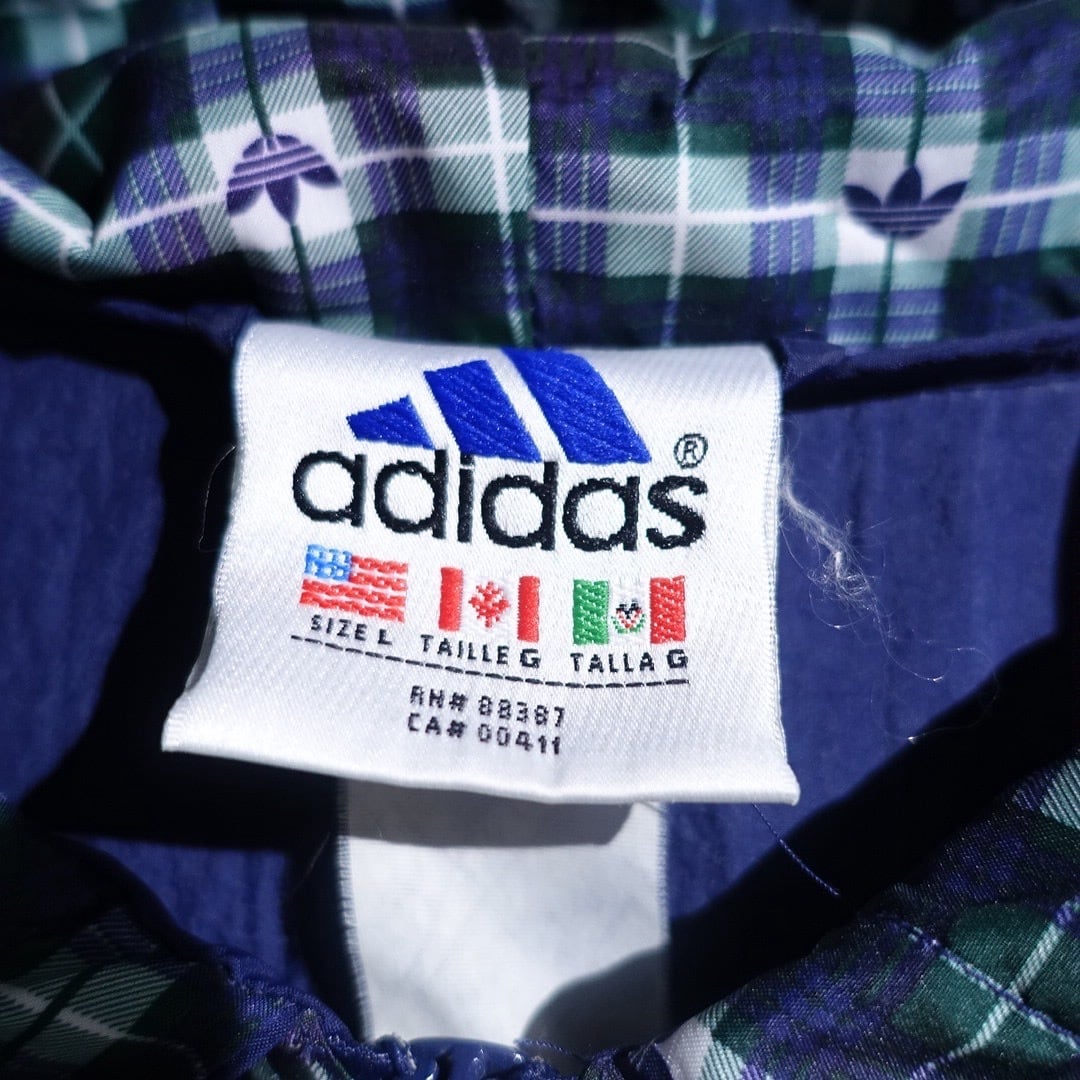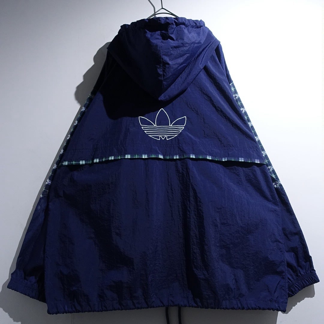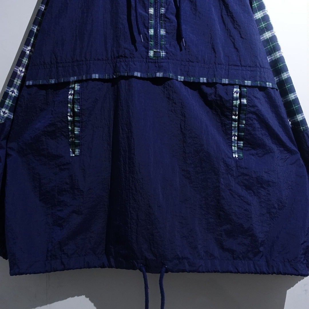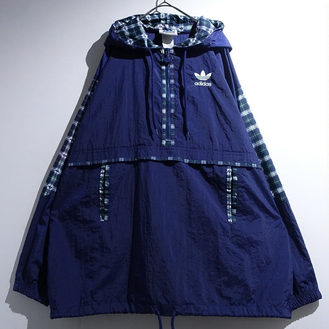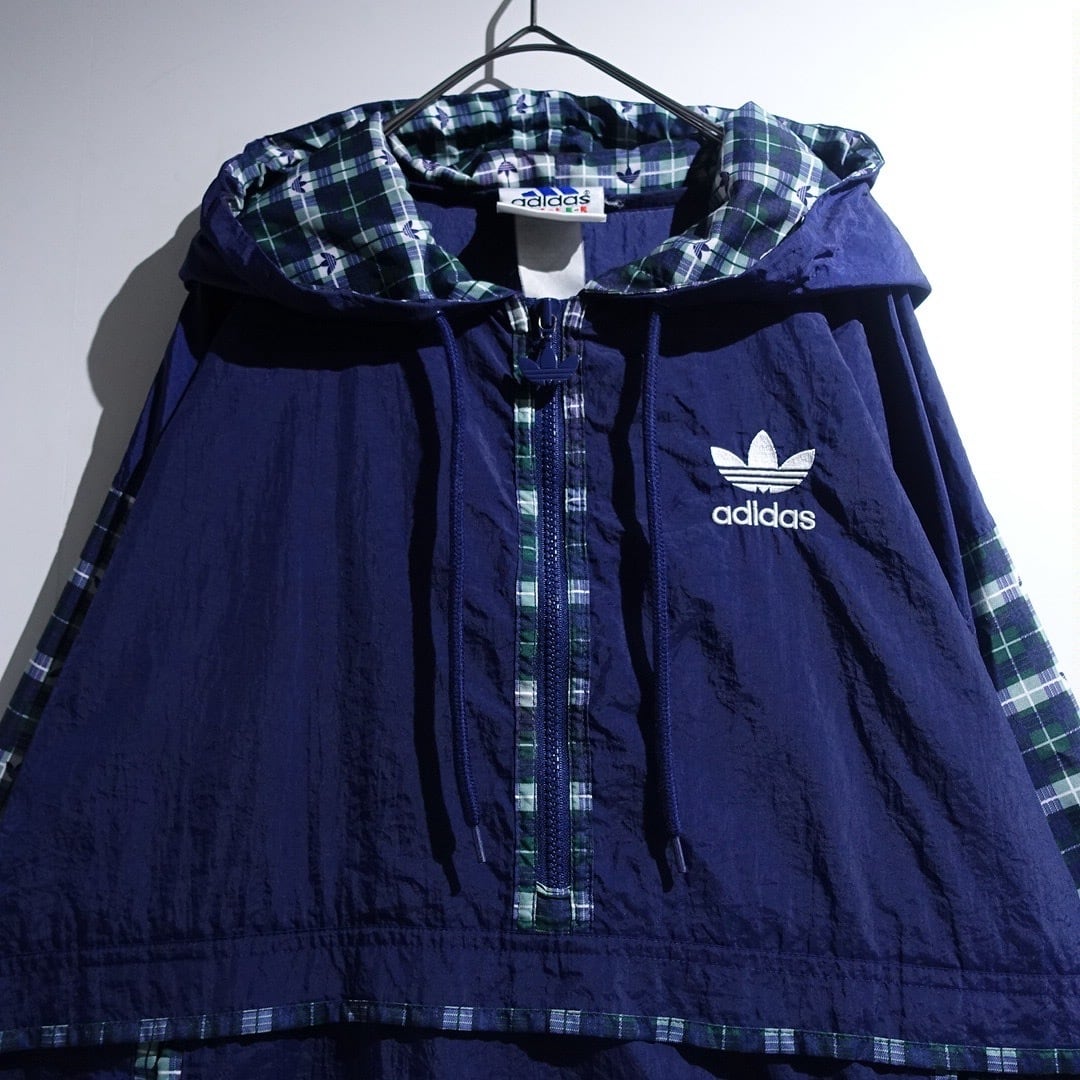 90s "adidas" Navy Logo Check Switching Half-Zip Design Nylon Anorak Jacket