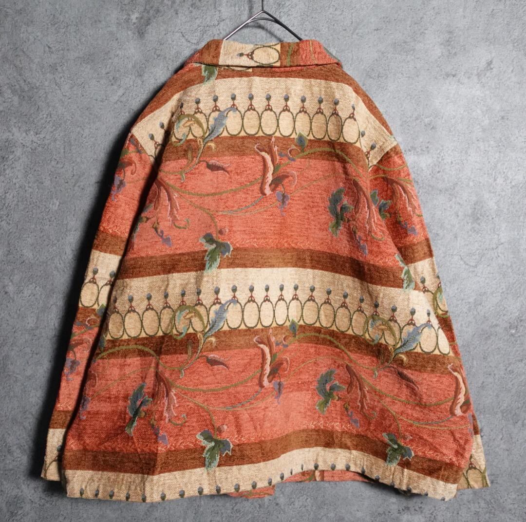 発色の良いピンク、ベージュ、ブラウンのボーダーに葉とツルをあしらったデザイン。