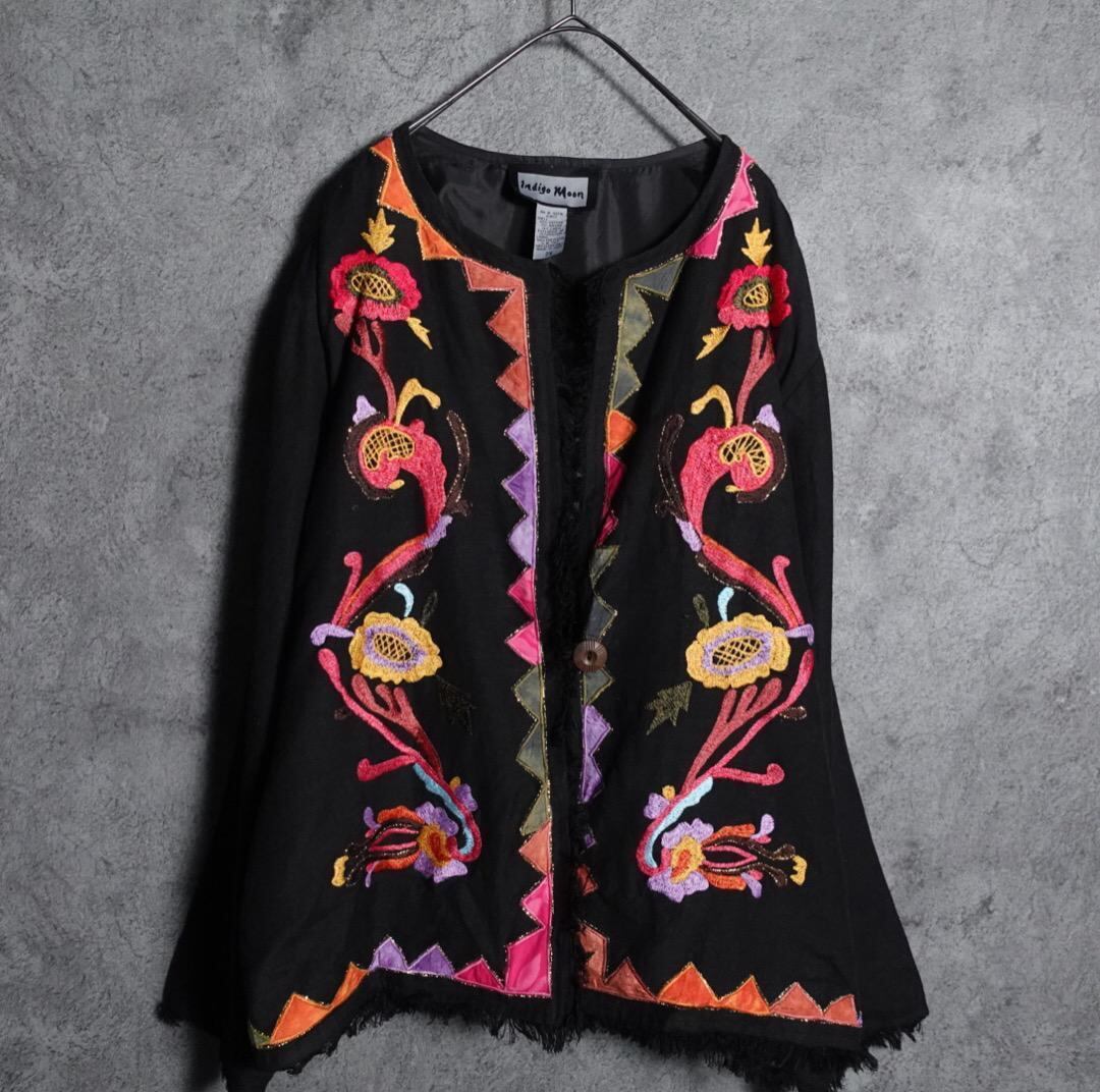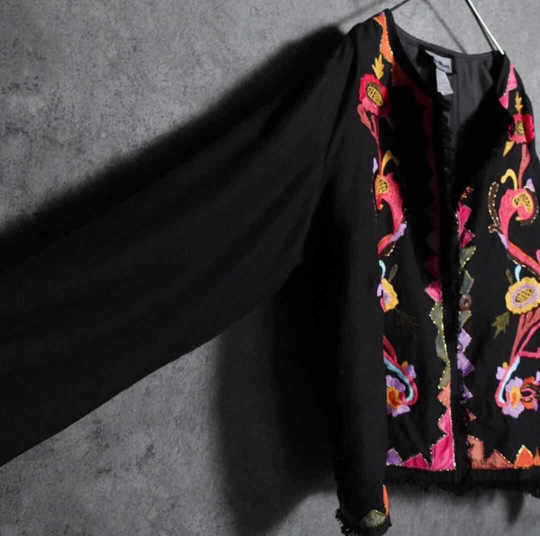 ブラックベースに発色の良い刺繍糸でギザギザのデザインで縁取りをし花の様な抽象的なモチーフ刺繍を贅沢に施した逸品。