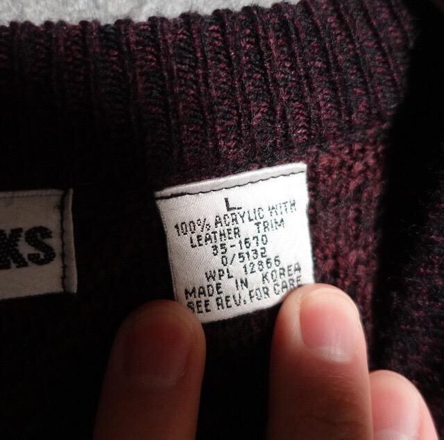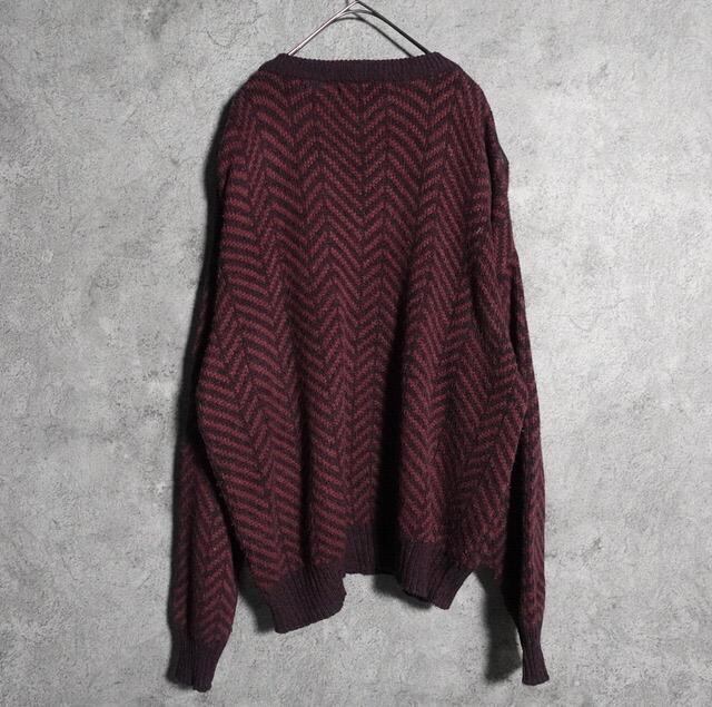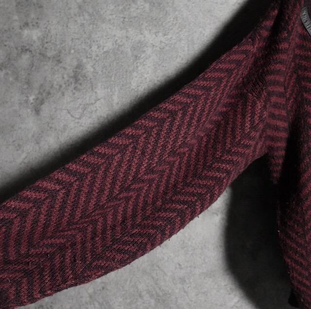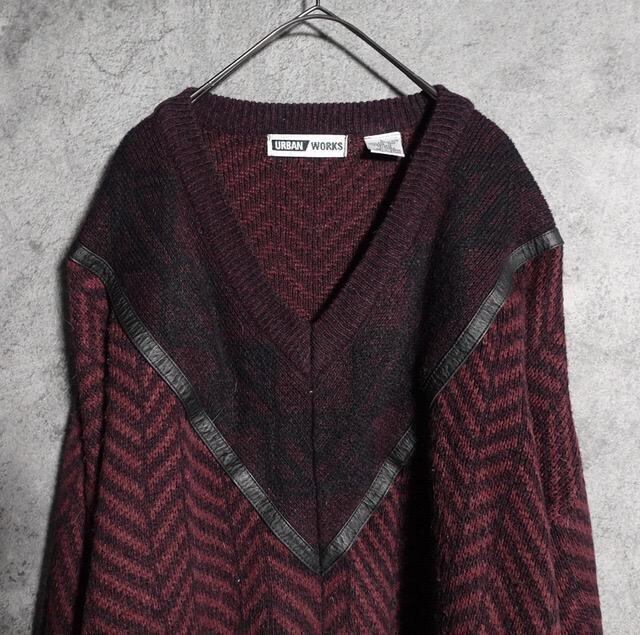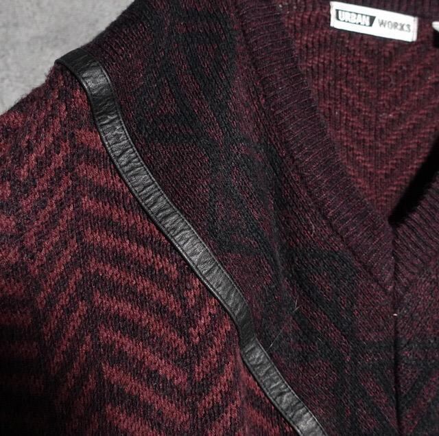 ヘリンボーンのような柄をベースにVネック部分に幾何学的な柄とレザーの切替がアクセントになっています。