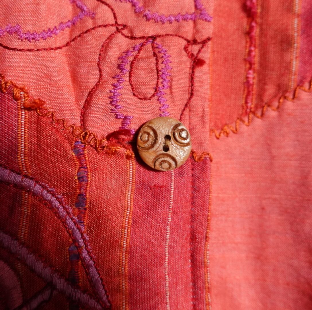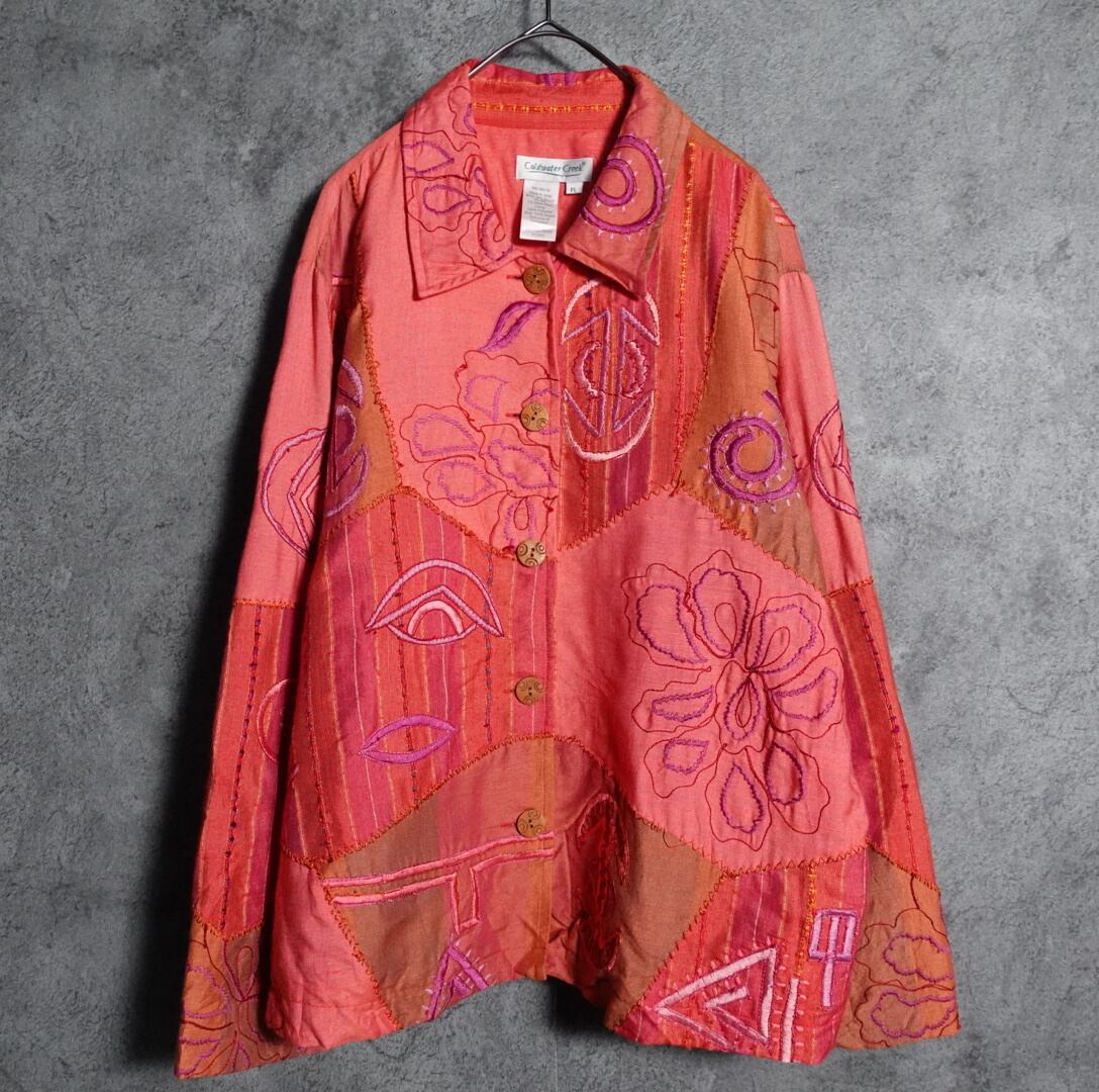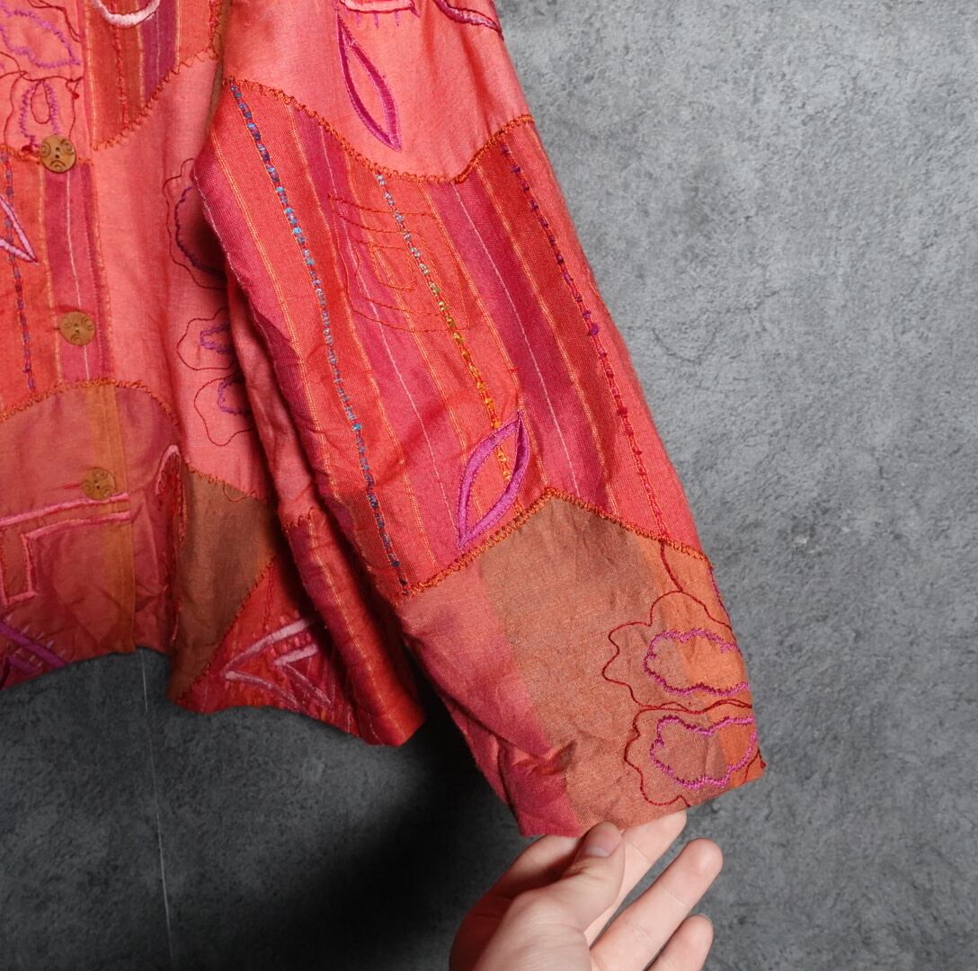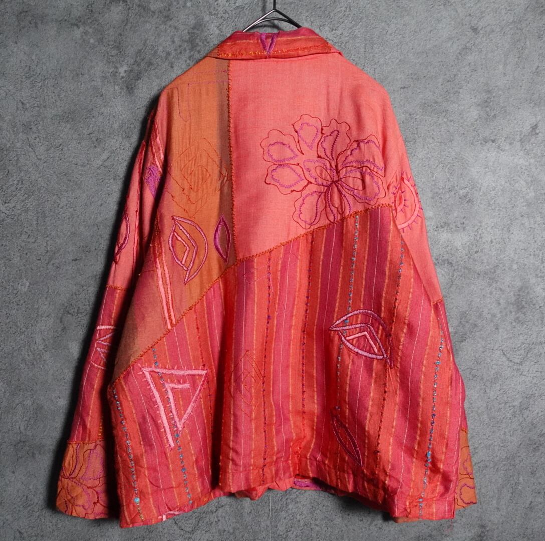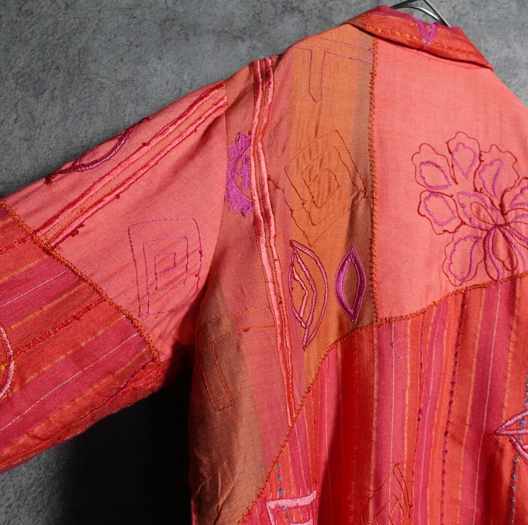 3種類の生地をパッチワーク状に組み合わせ、花や幾何学的なモチーフの刺繍を全面に施した凝りに凝ったデザイン。