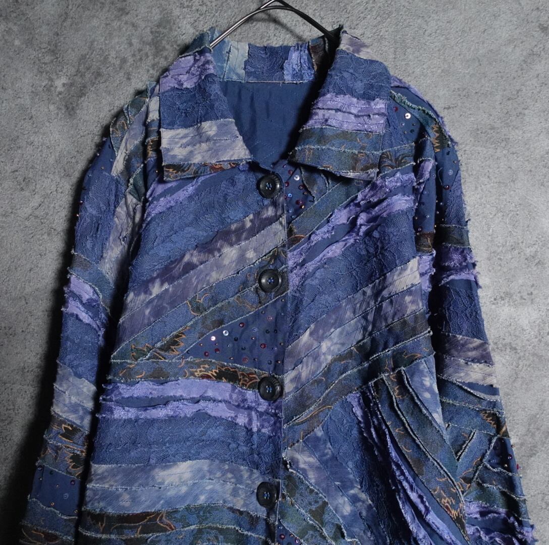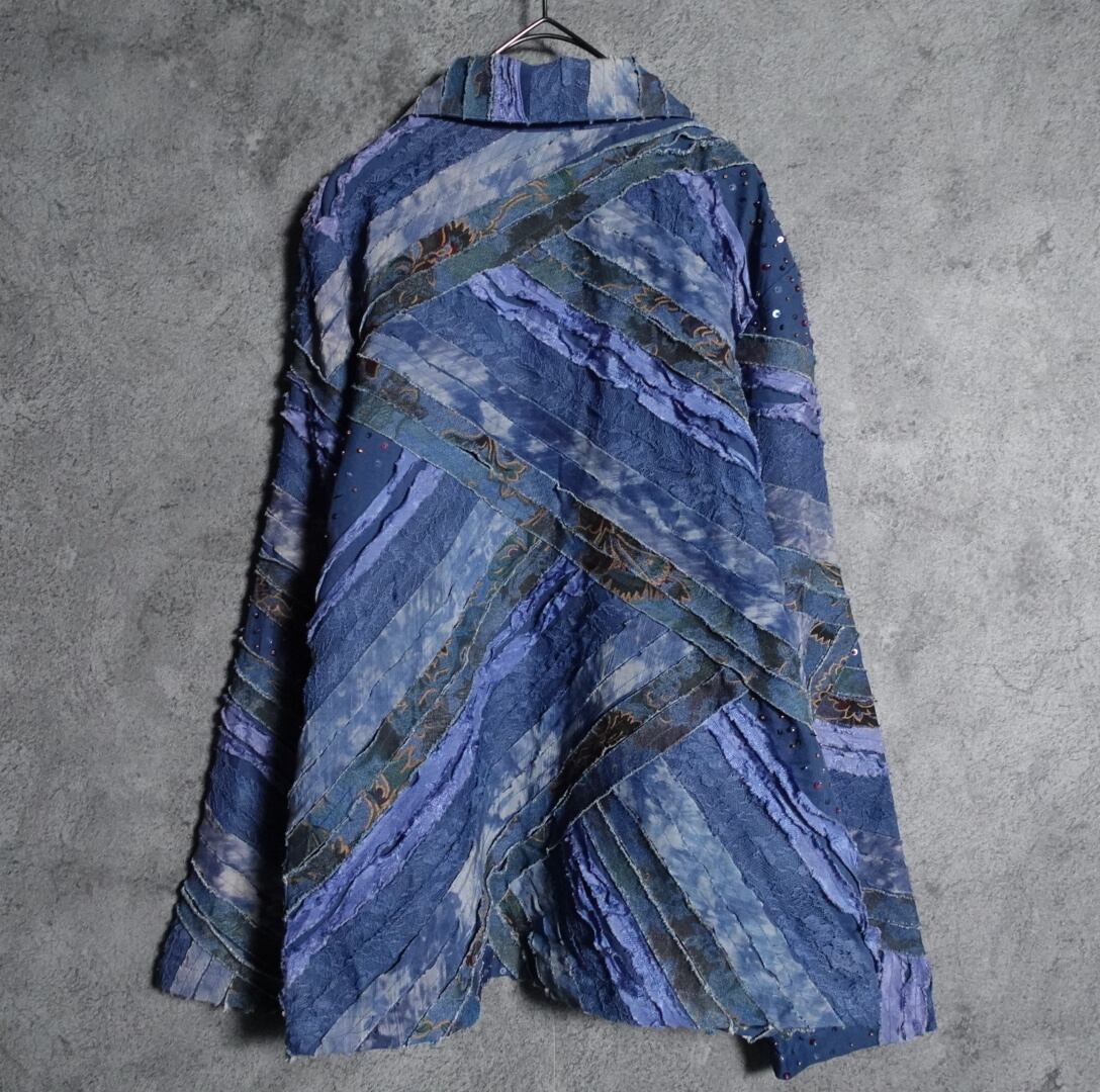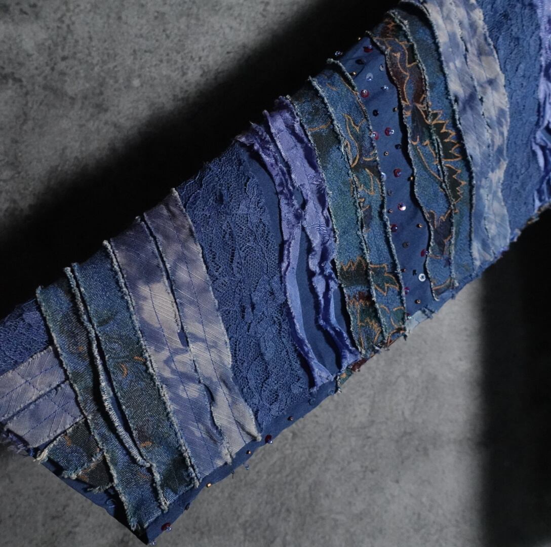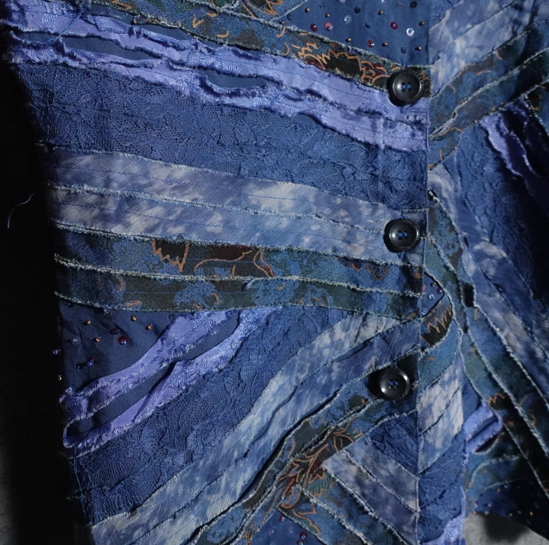ブルーベースにレースや柄の入った生地とビーズを全面に縫い合わせた凝りに凝ったスペシャルなデザイン。