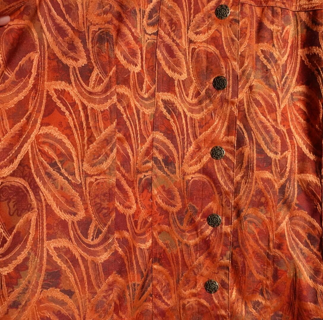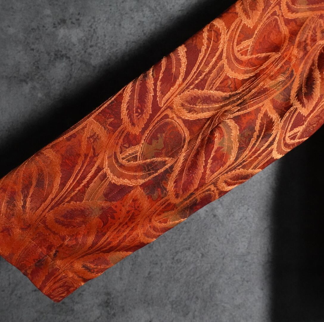 オレンジベースにフラワープリントを全面にあしらい、さらに、フェザーモチーフの刺繍を全面に施した凝ったデザインです。