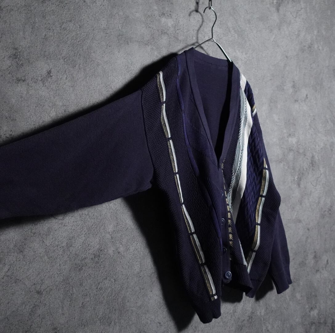 編みと色によるおよそ6種類の柄をストライプ状に広げた立体感のある洒落たデザイン。