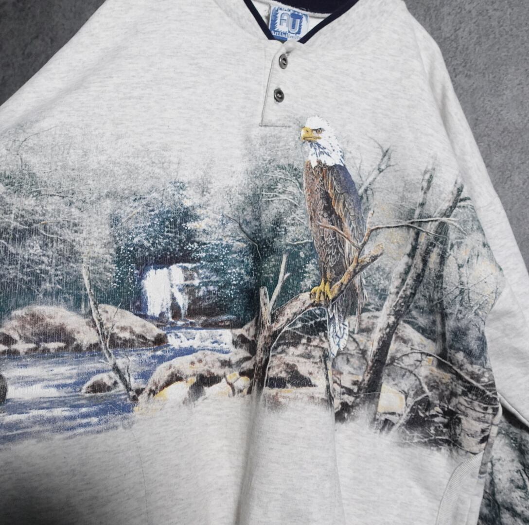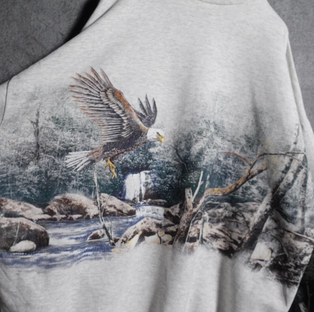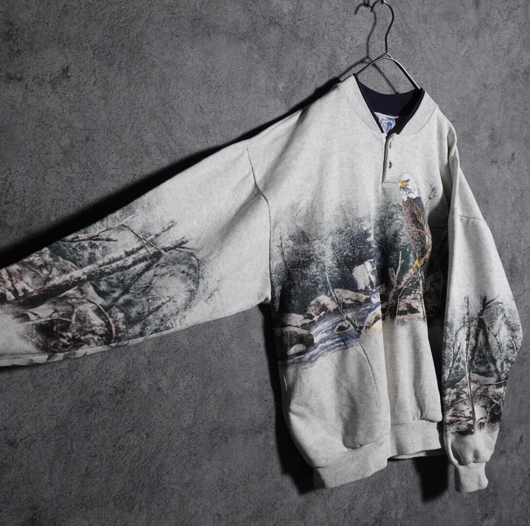 両面に渓流に佇む鷹を両面違ったデザインでプリントし、袖にも風景をあしらった凝った珍しいデザイン。