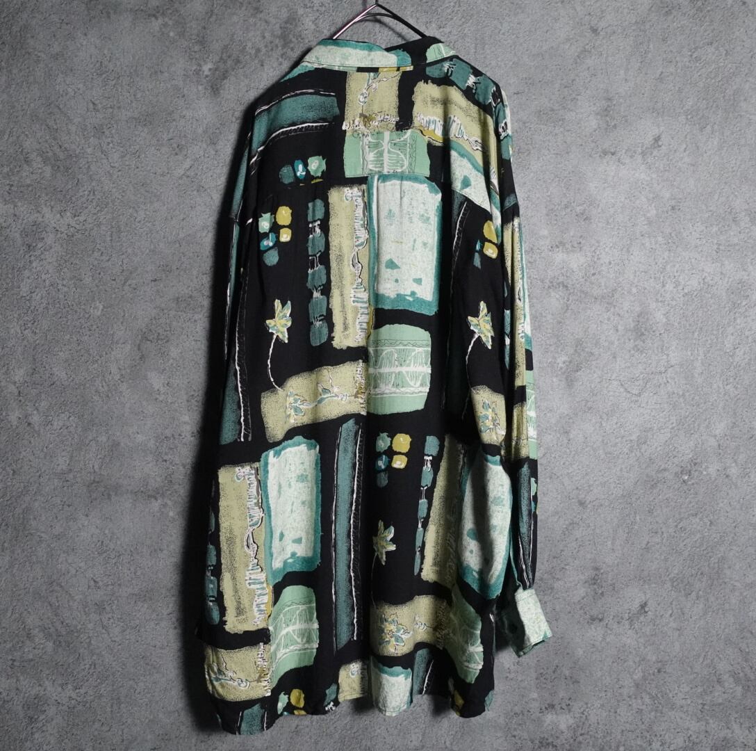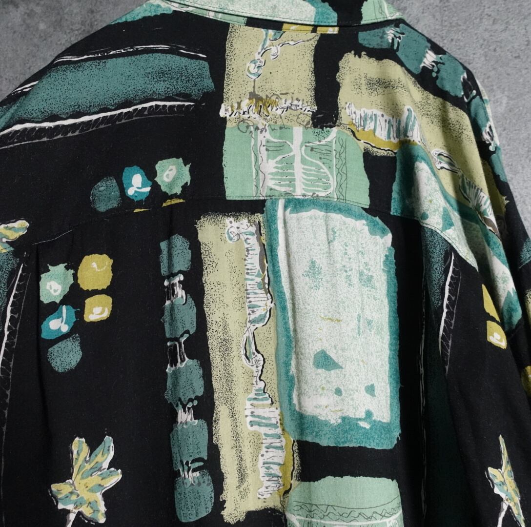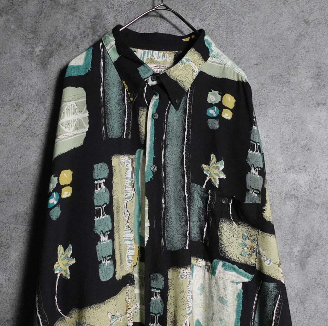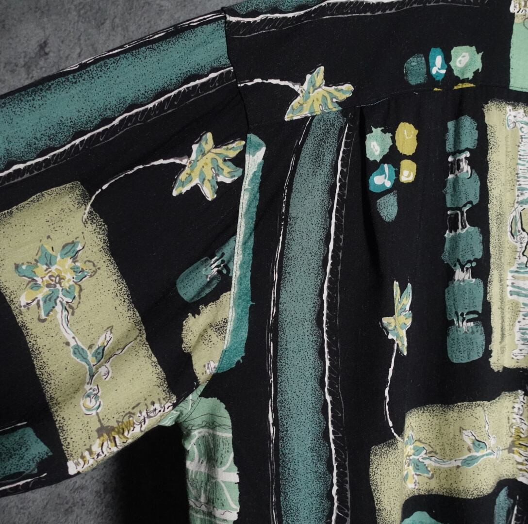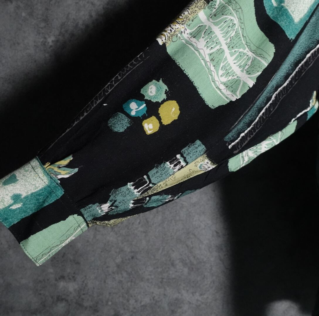 ブラックベースに花のモチーフや抽象的なアートタッチな柄を全面にあしらったアーティスティックなデザイン。