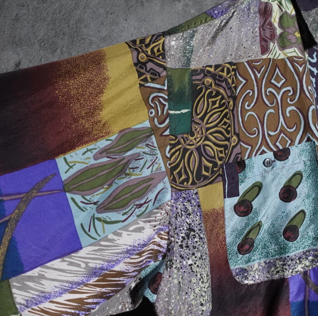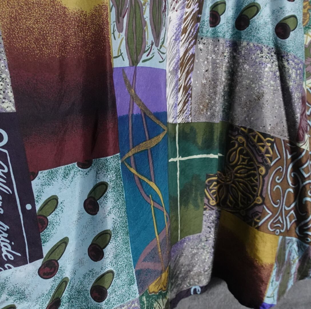花、アルファベット、幾何学、ペイントなどのプリントをバラバラに組み合わせた手の込んだデザインです。