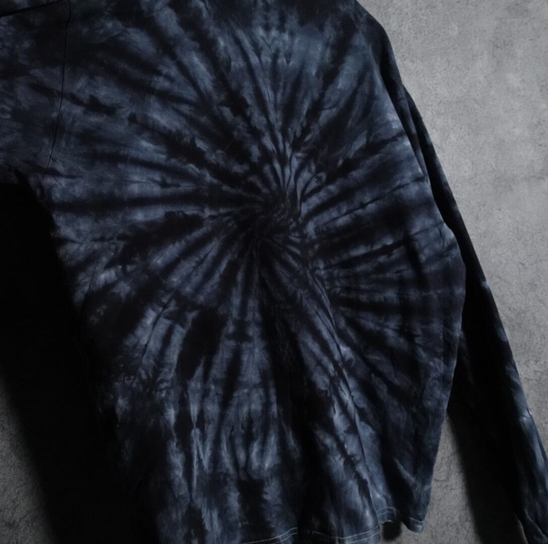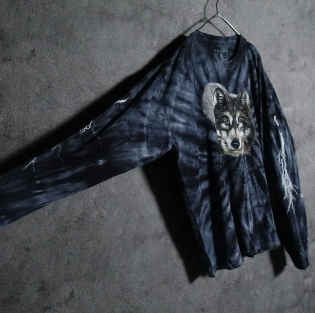 ブラックとブルーグレーのタイダイ柄をベースに、狼と月を中央に、雷を両袖にプリントした洒落たデザイン。