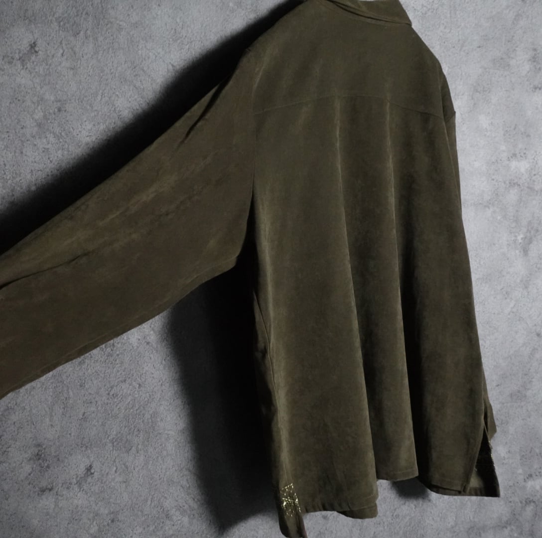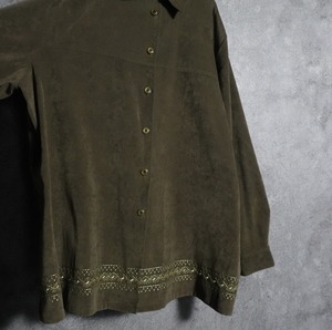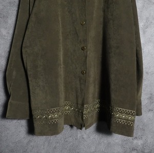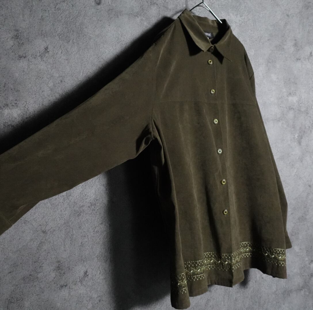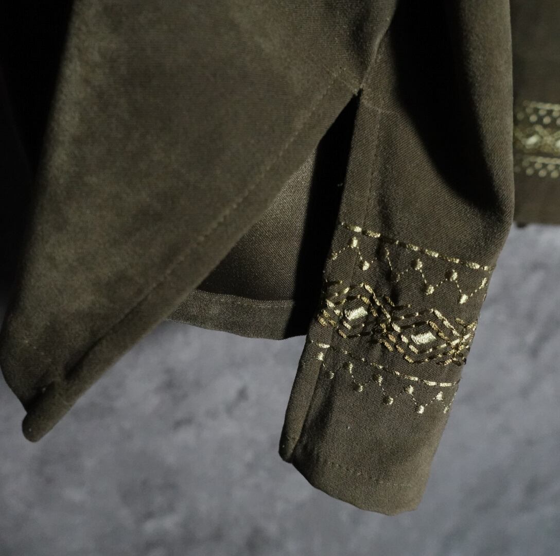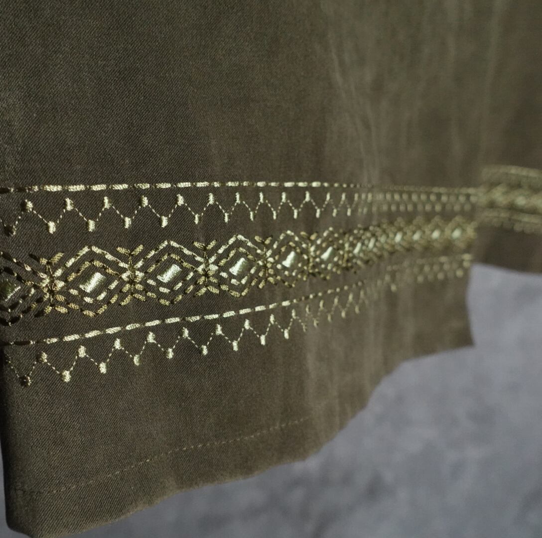 カーキグリーンをベースに裾周辺のみに繊細な刺繍を施した洒落たデザイン。