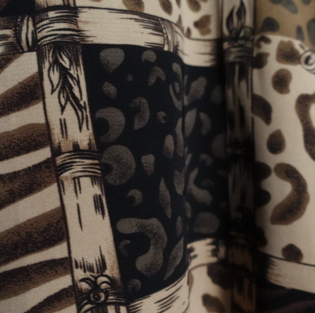 様々なレオパード柄を木の枠で囲いパネル状に広げたようなアーティスティックなデザイン。