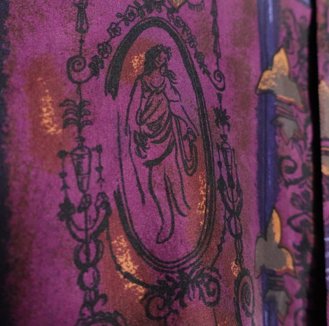 パープル×ネイビーをベースに女神、花壇、ランプのモチーフをパネルのように全面にあしらったアーティスティックなデザイン。