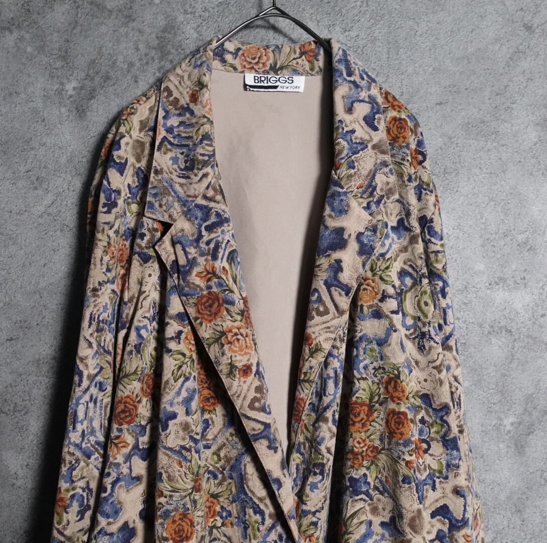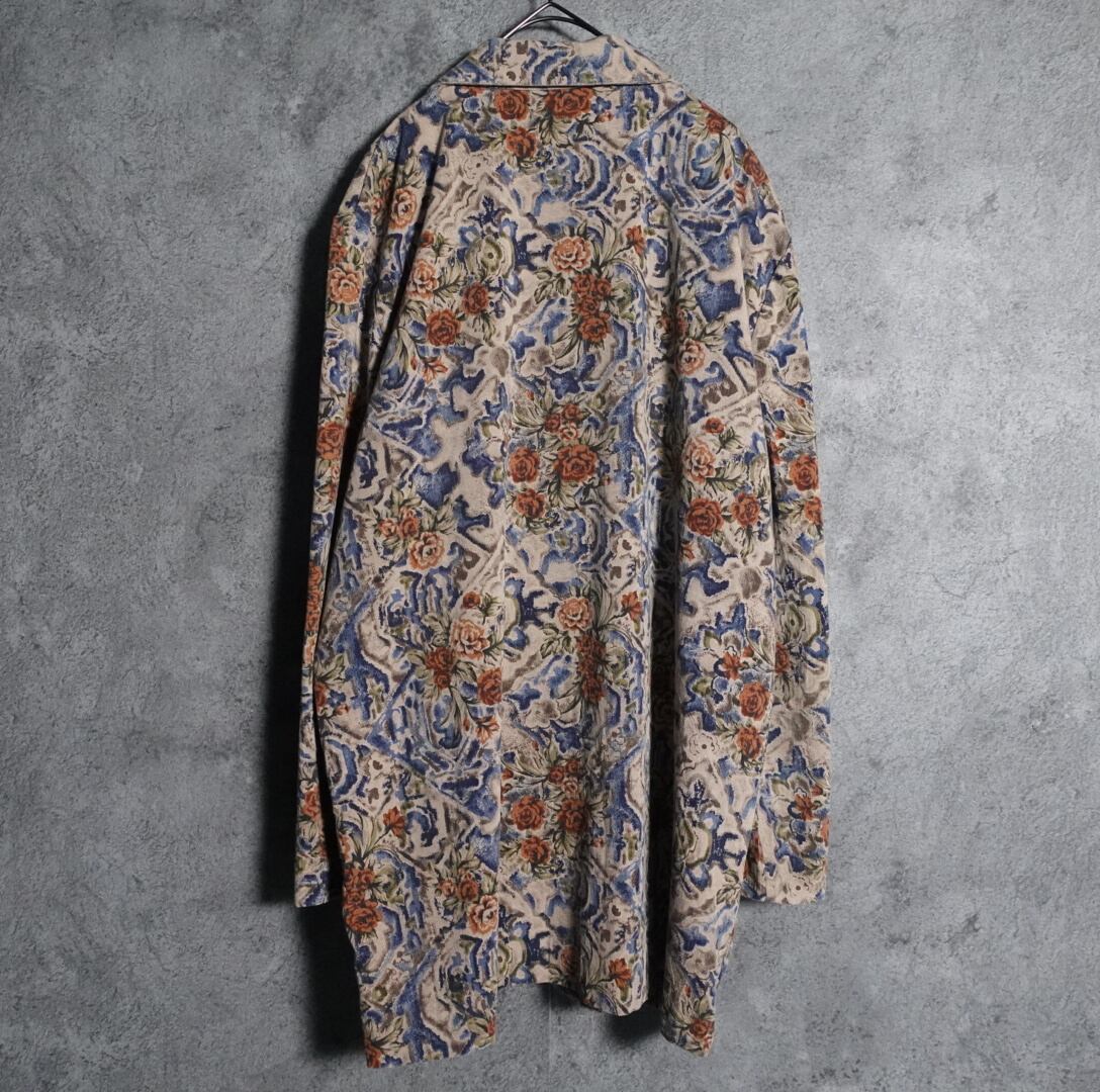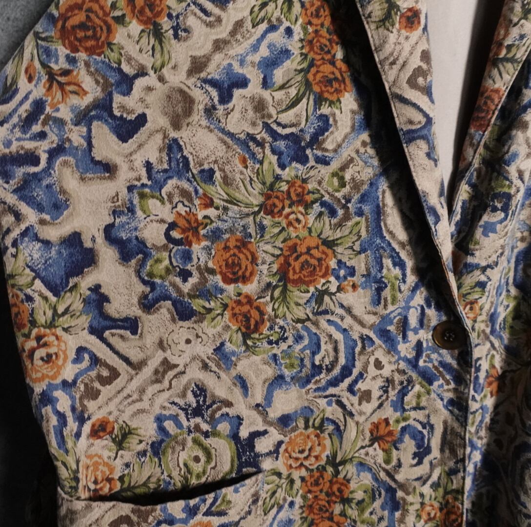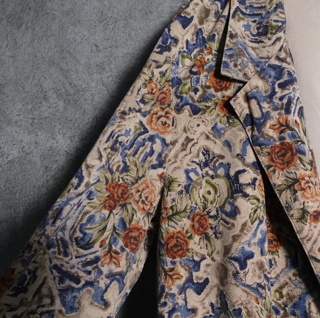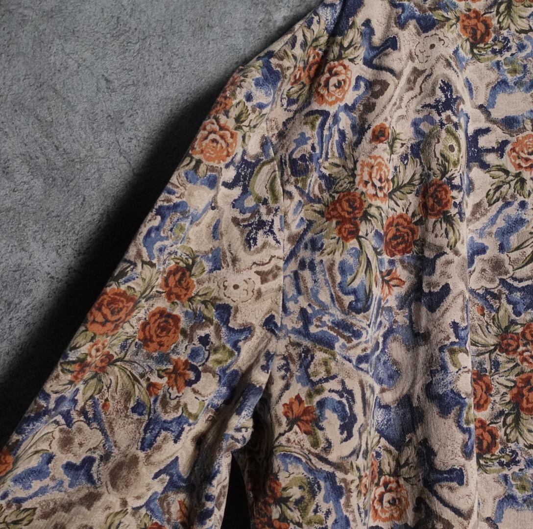 抽象的な柄をベースに薔薇を全面にあしらった、洒落の効いたデザイン。