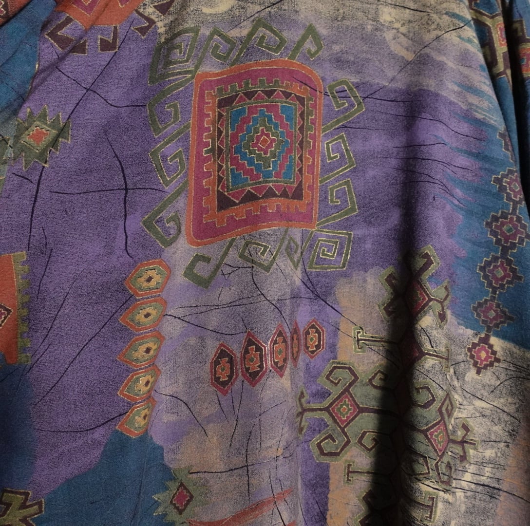 パープルをベースにグリーン、ダークグリーン、オレンジなどの色のネイティブ柄を全面にあしらったデザイン。