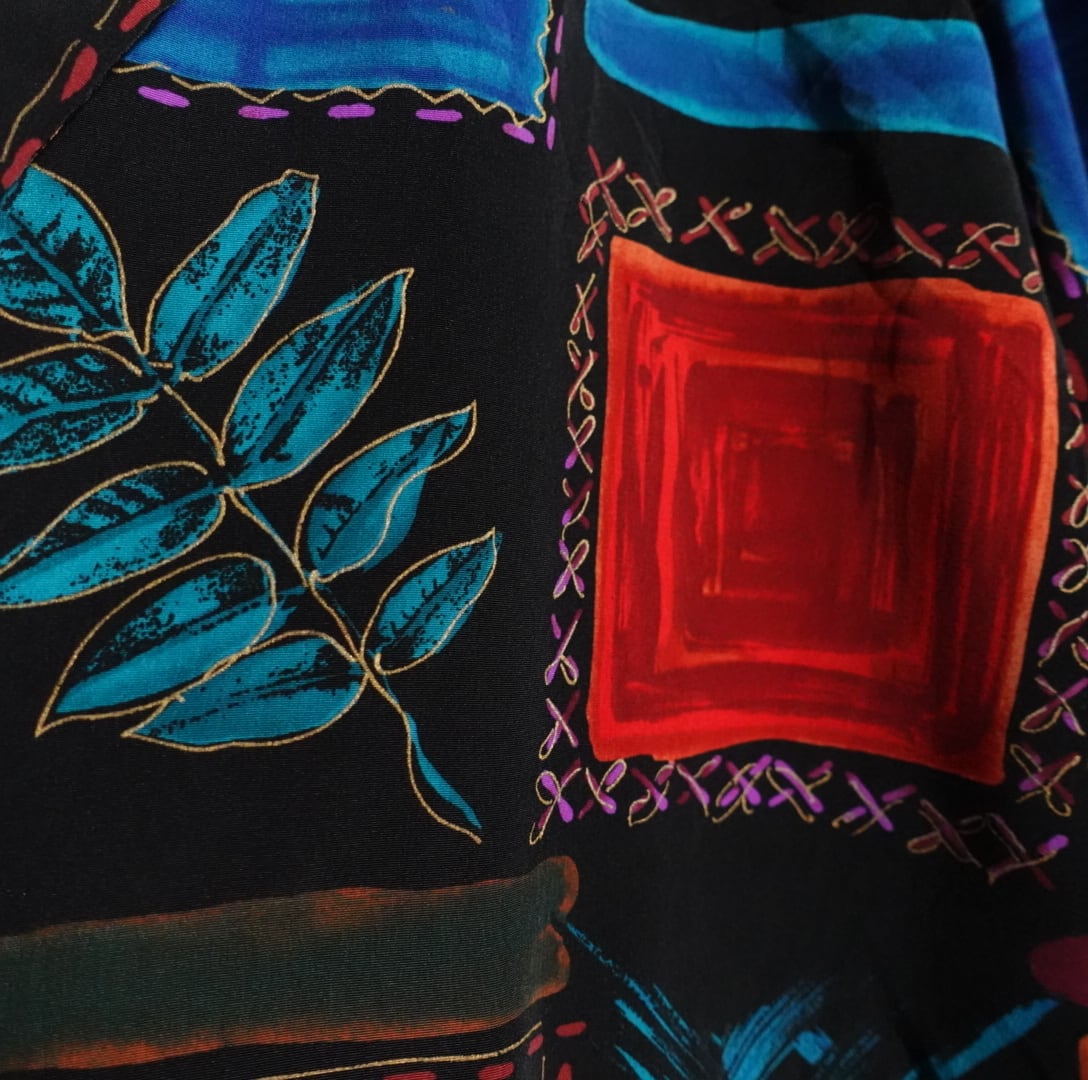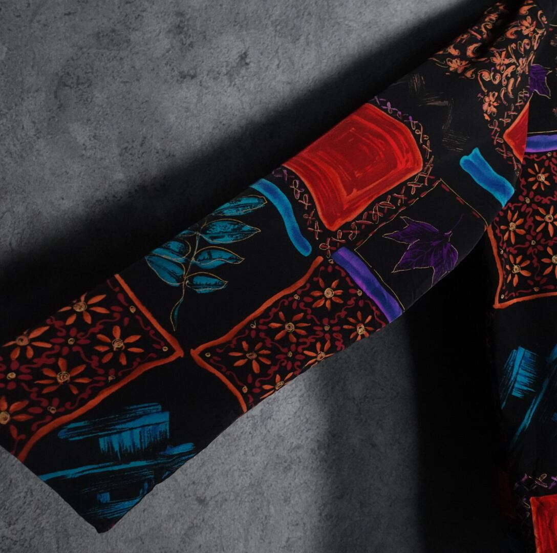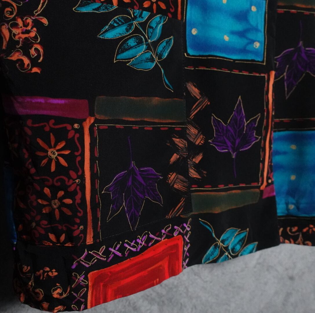 ブラックベースにライトブルー、パープル、レッド、オレンジなど様々な色の葉や抽象画を全面にあしらったアーティスティックなデザイン。