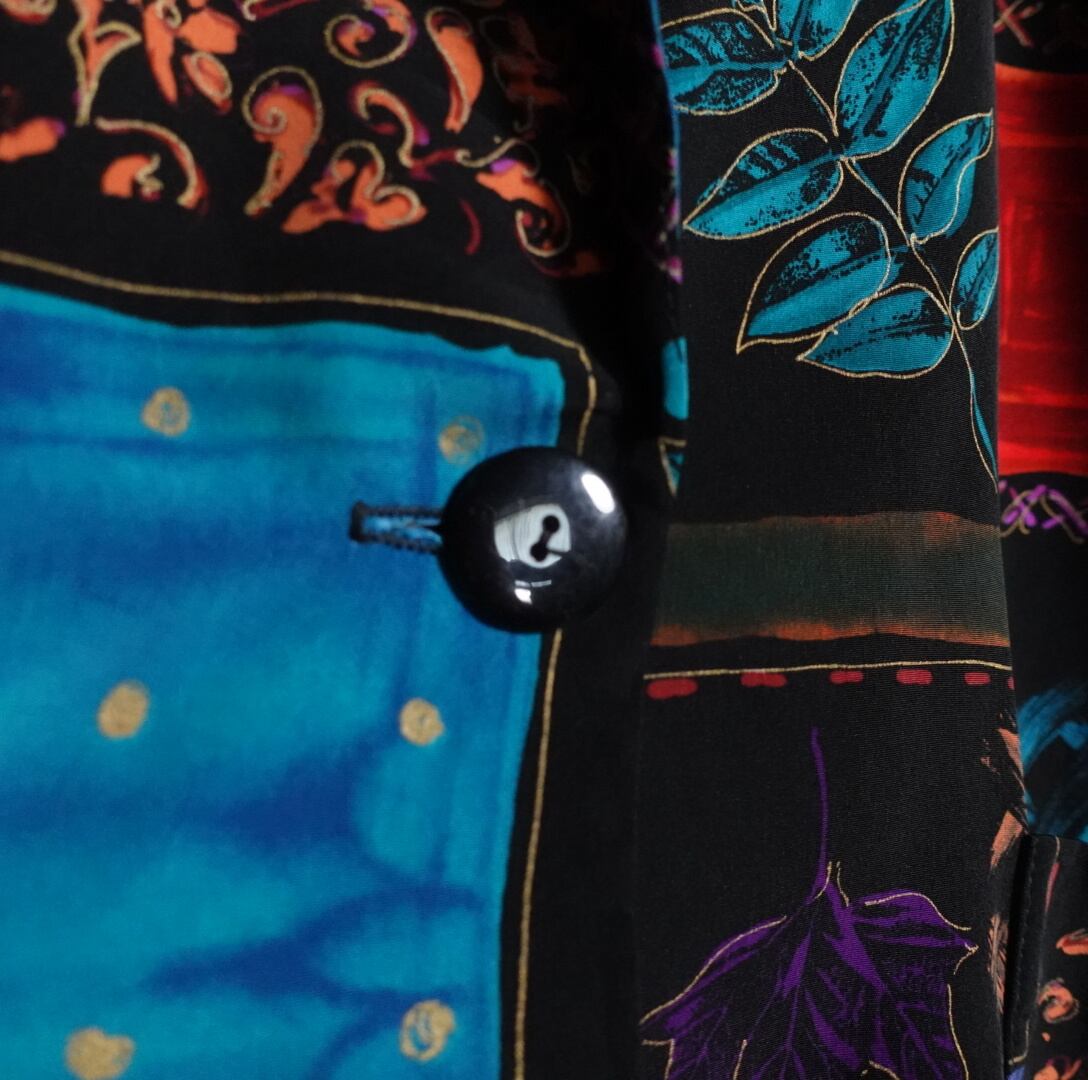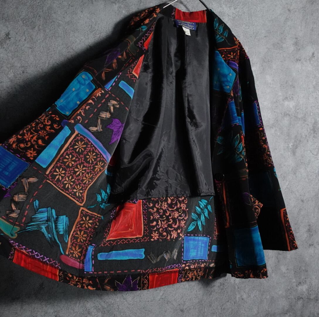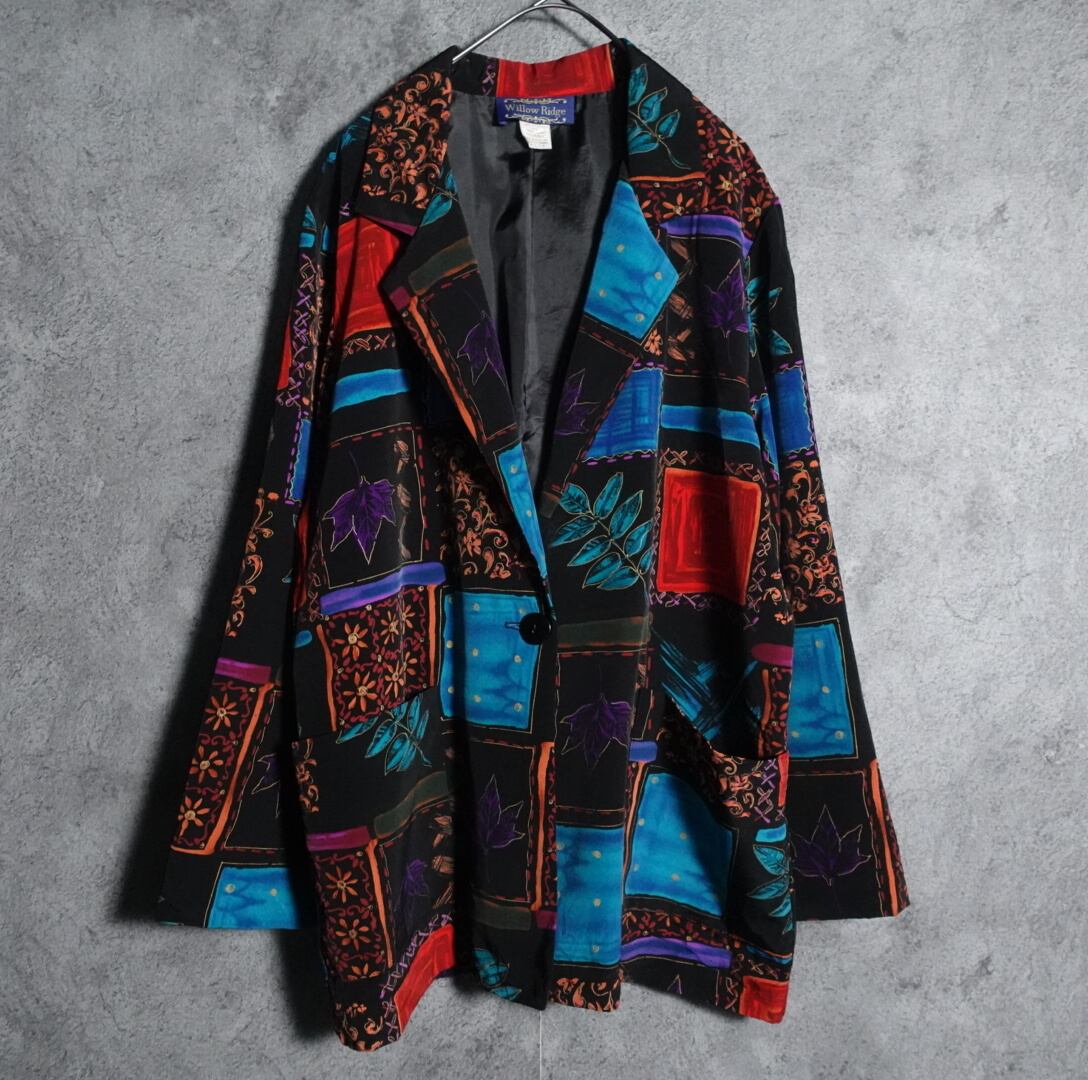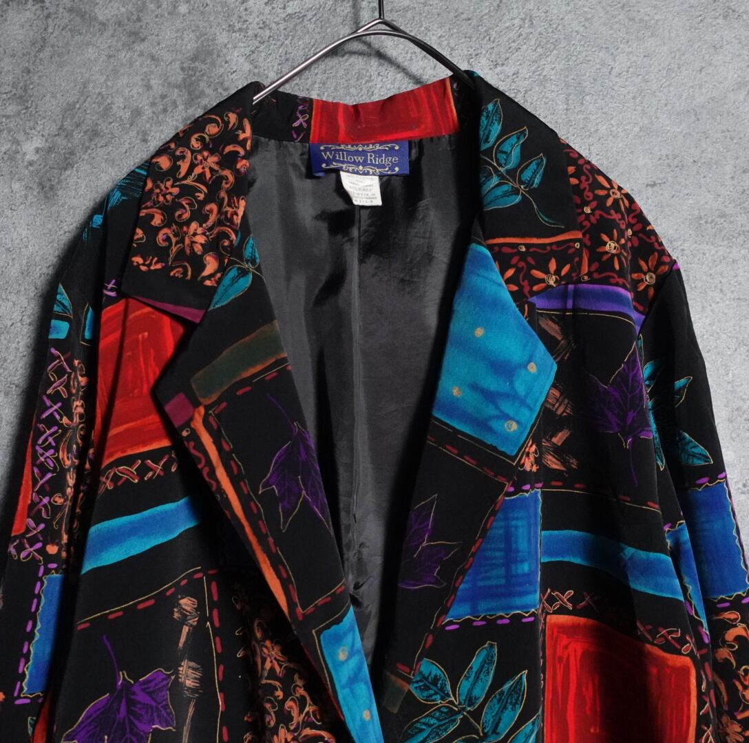 ブラックベースにライトブルー、パープル、レッド、オレンジなど様々な色の葉や抽象画を全面にあしらったアーティスティックなデザイン。