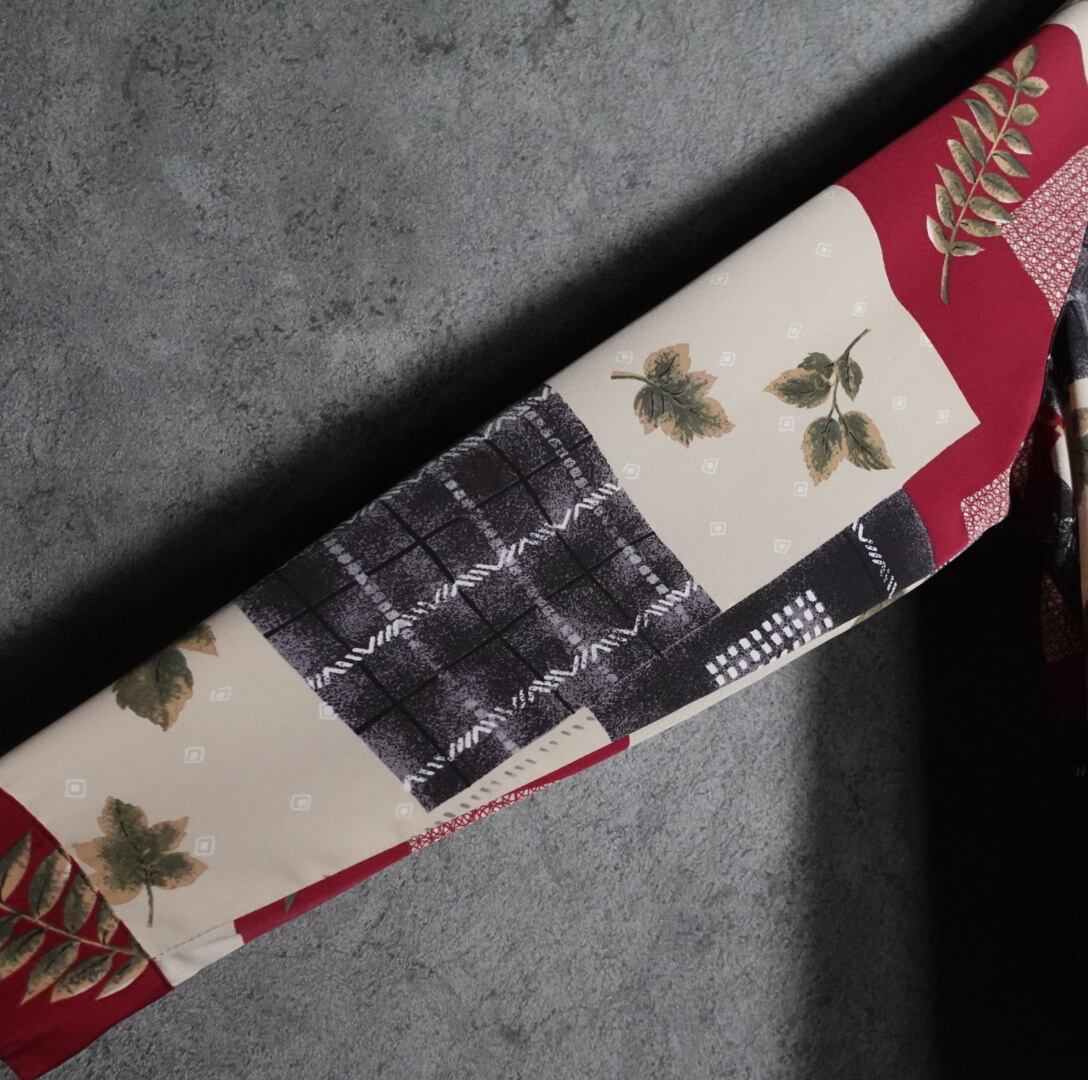 アイボリー、ワインレッド、ブラックのパネルに花や幾何学模様などをあしらったアーティスティックなデザイン。