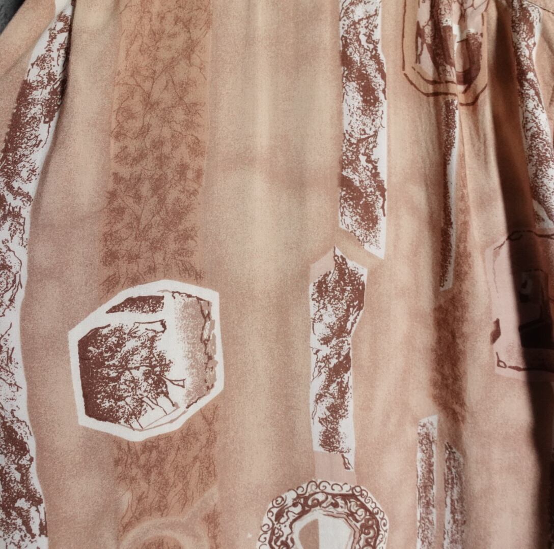 ベージュベースにホワイト、ブラウンのアーティスティック柄を全面にあしらったデザイン。