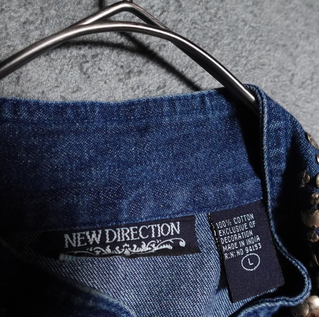 デニムに袖先、裾、襟、ジップ脇に大小様々な円の金具を施したデザイン。