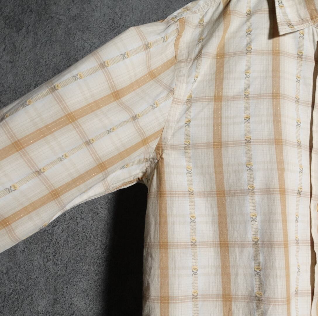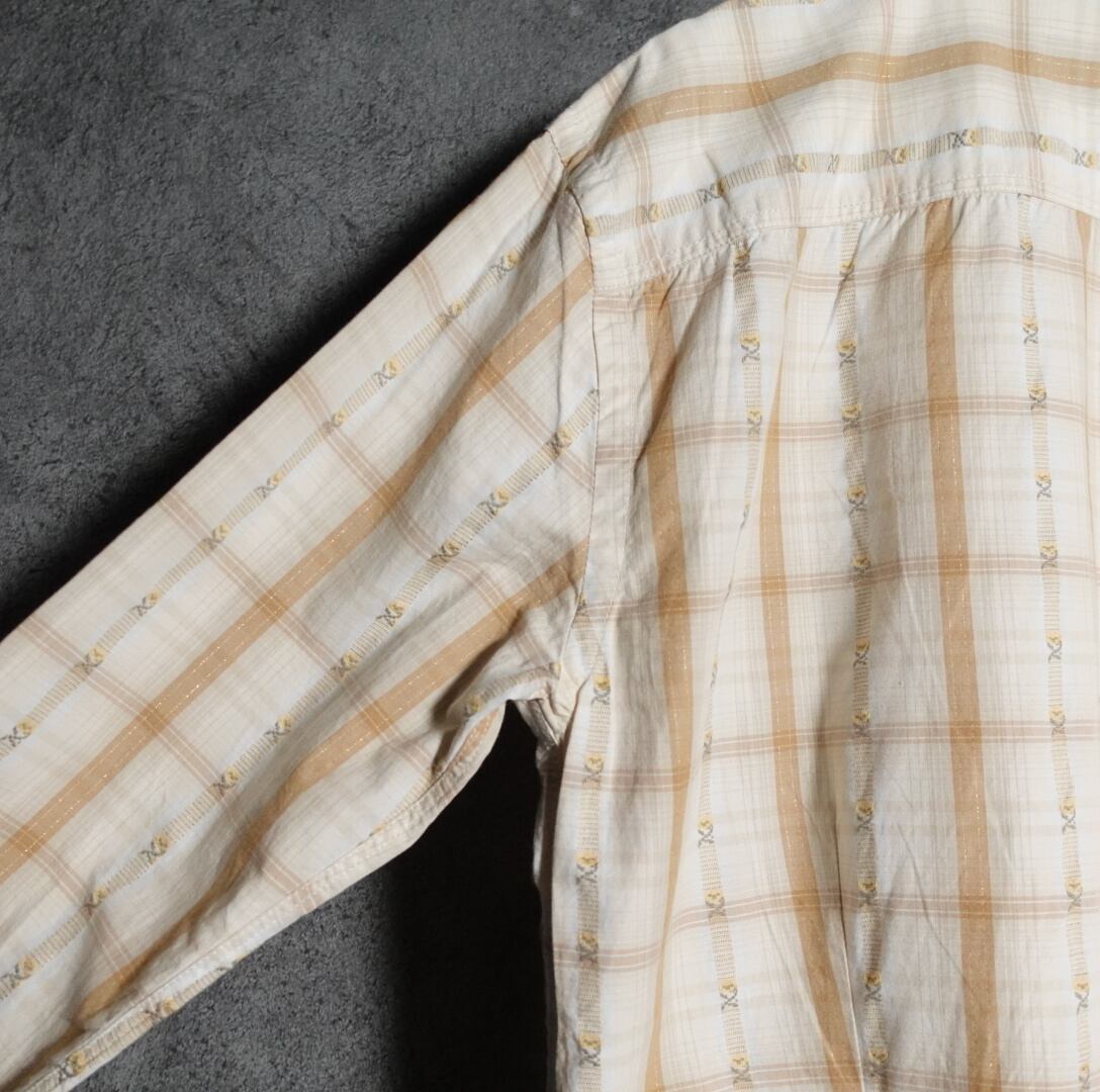 ベージュ、ブラウン、ホワイトのチェックにストライプ状にフラワー刺繍を施した洒落の効いたデザイン。