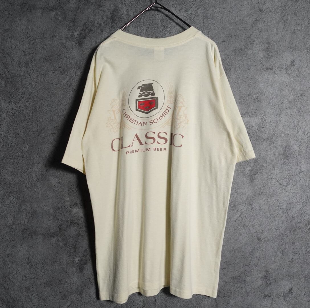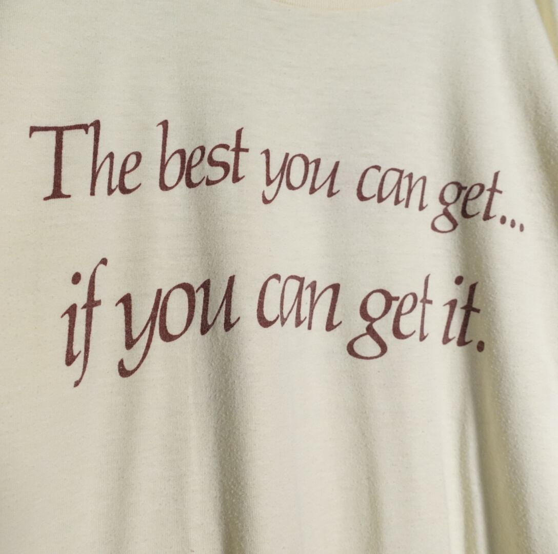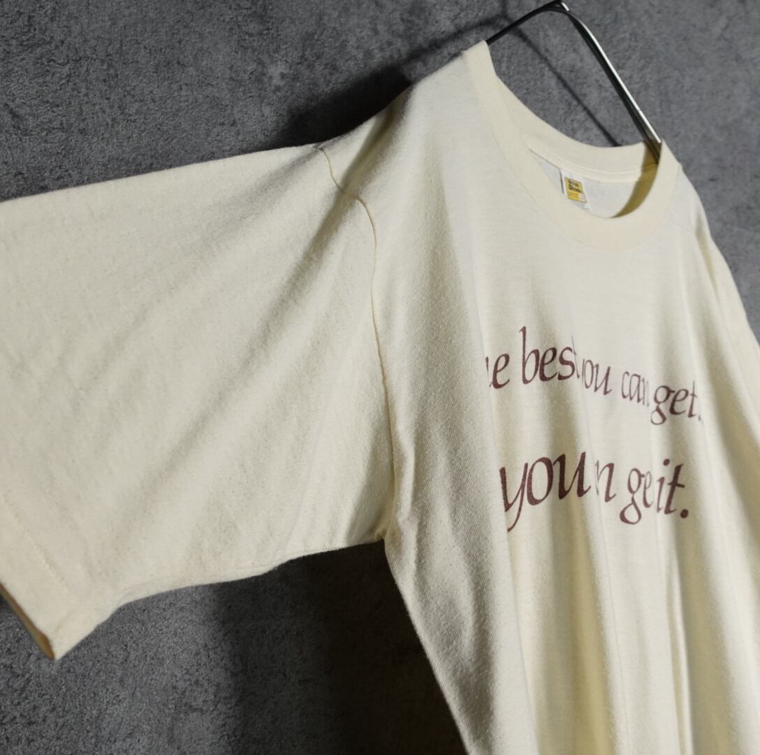 ライトイエローをベースに表面には、日本語で訳すと「あなたは最高のものを手に入れることができます」という良い感じのメッセージプリントがされており、裏面にはクリスチャン·シュミット·クラシック·プレミアム·ビールと記されています。おそらくビールの企業の記念Tシャツかと思われます。
