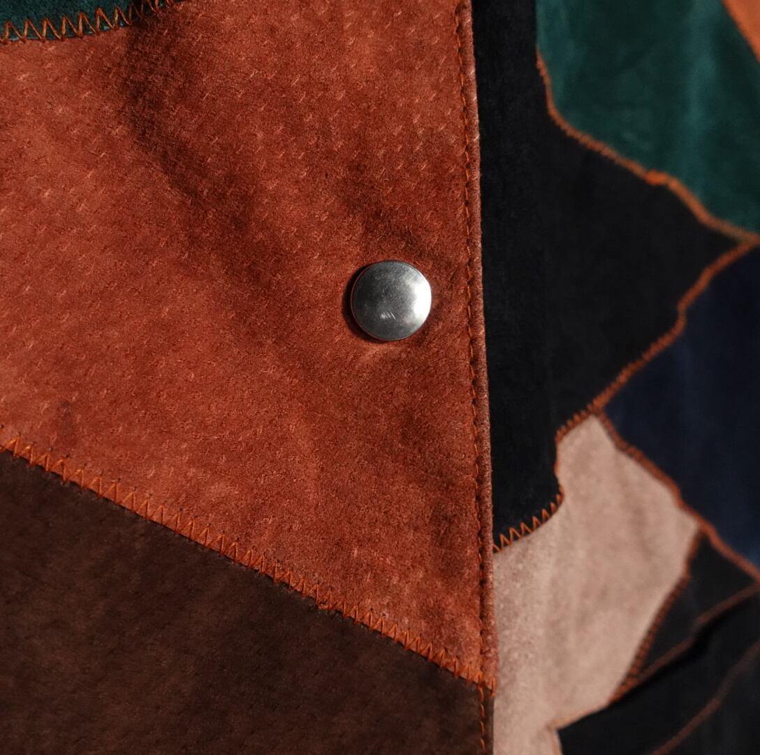 それぞれのカラーのスウェード生地を刺繍でバラバラに縫い合わせたパッチワークデザイン。