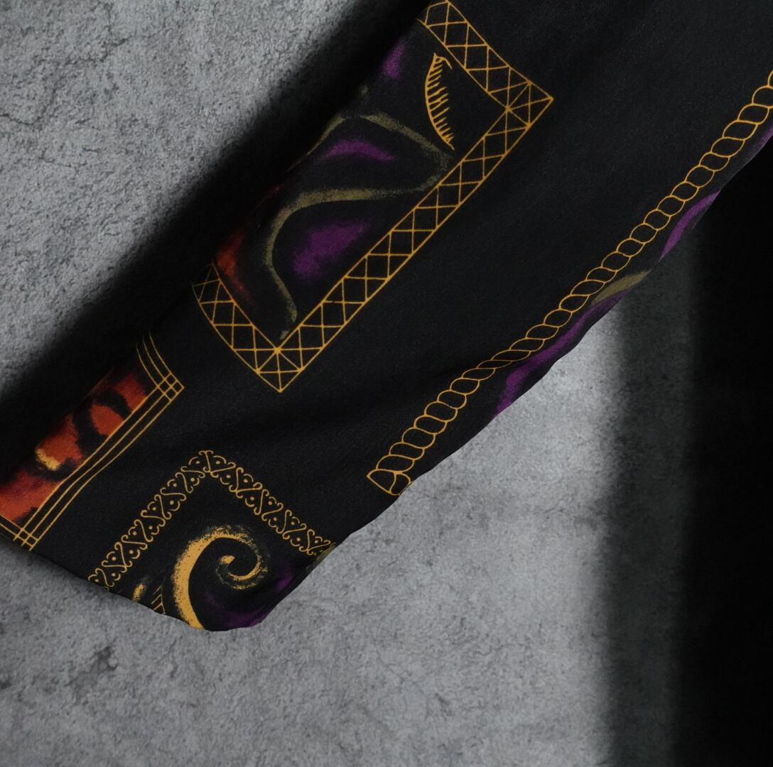 ブラックベースにゴールドの額縁にダークグリーン、パープル、イエロー、ダークオレンジなどの抽象的な柄をあしらったアーティスティックなデザイン。