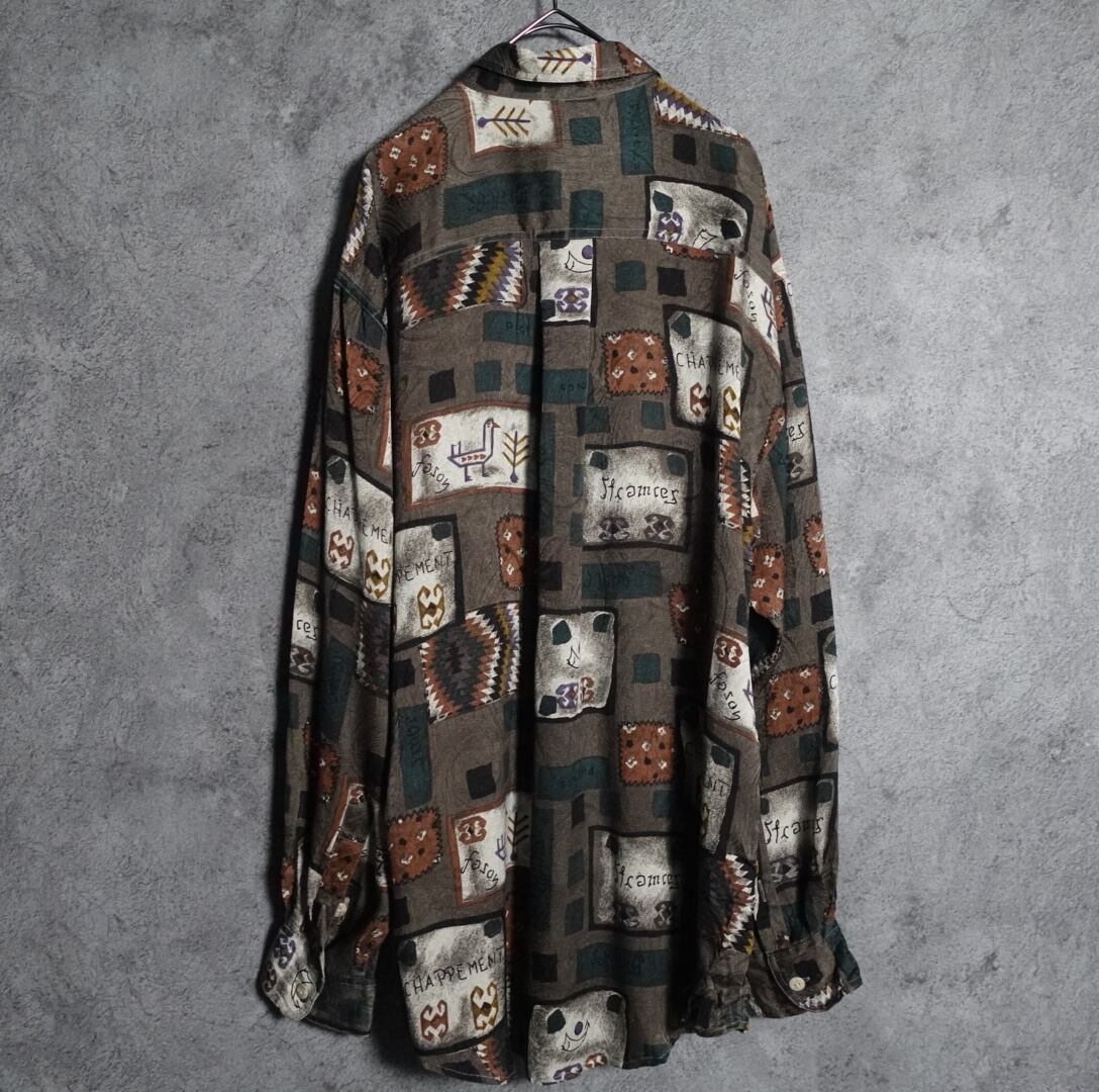 チャコールブラウンをベースにホワイト、ブラウン、ダークグリーン、などのネイティブ柄、パネルやアルファベットをバラバラに全面にあしらったデザイン。