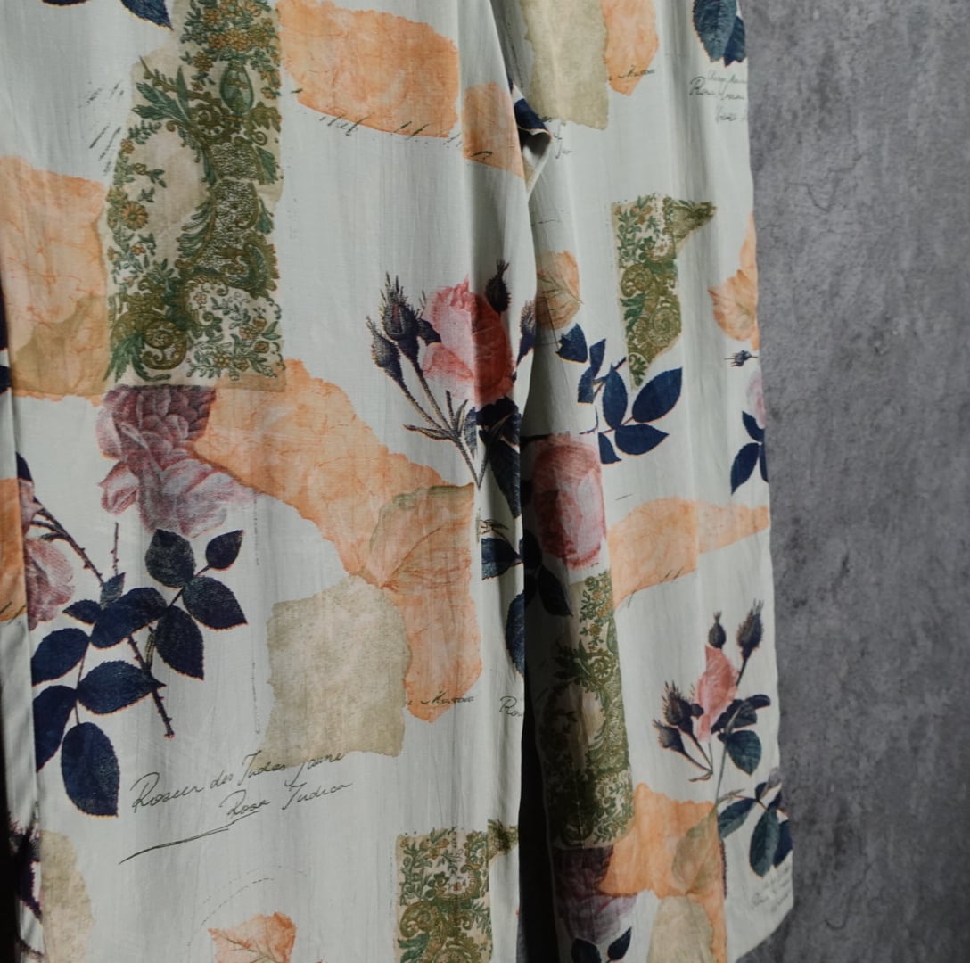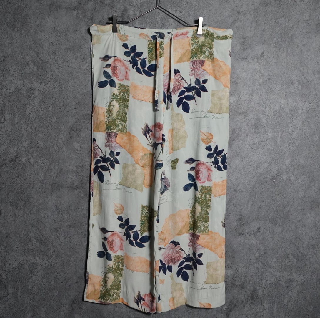 ミントグリーンをベースピンク、ベージュ、グリーンのバラ、落ち葉、ボタニカルをあしらったパンツでは珍しいデザイン。